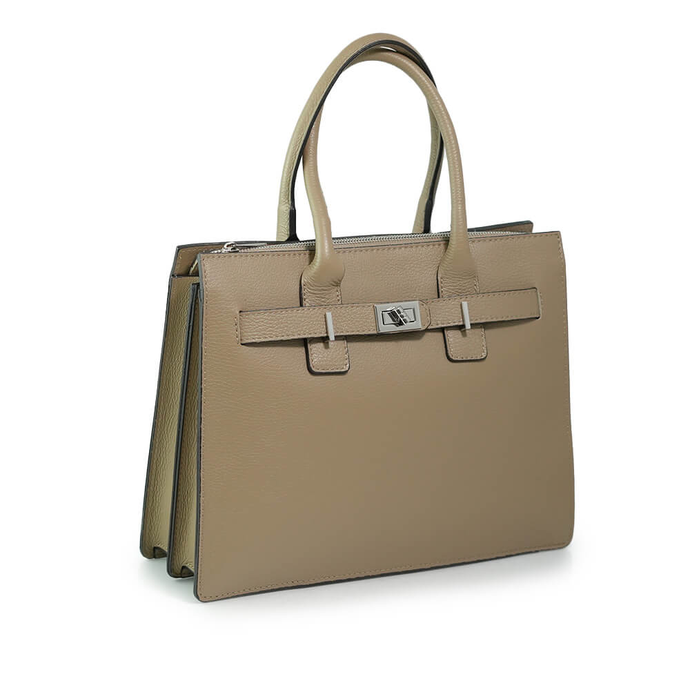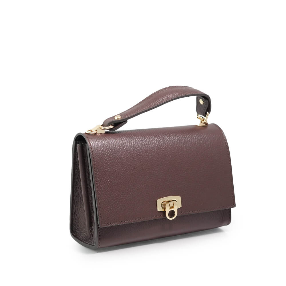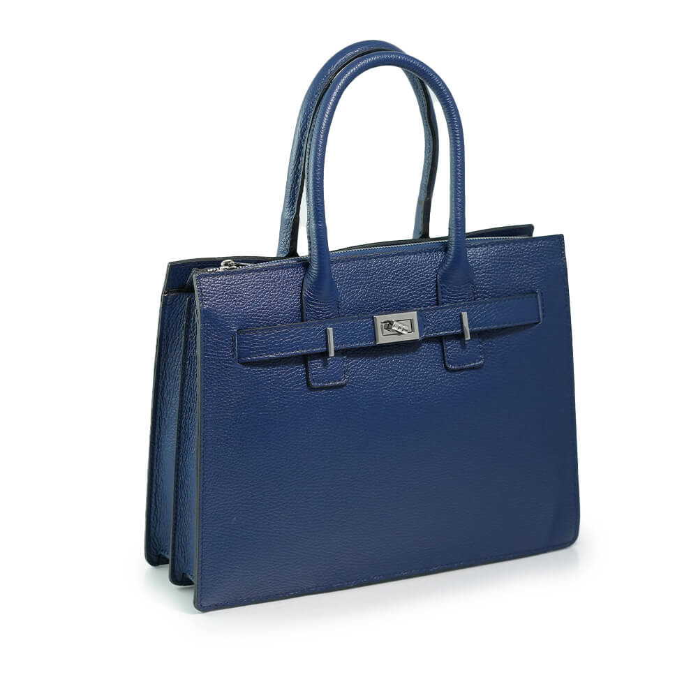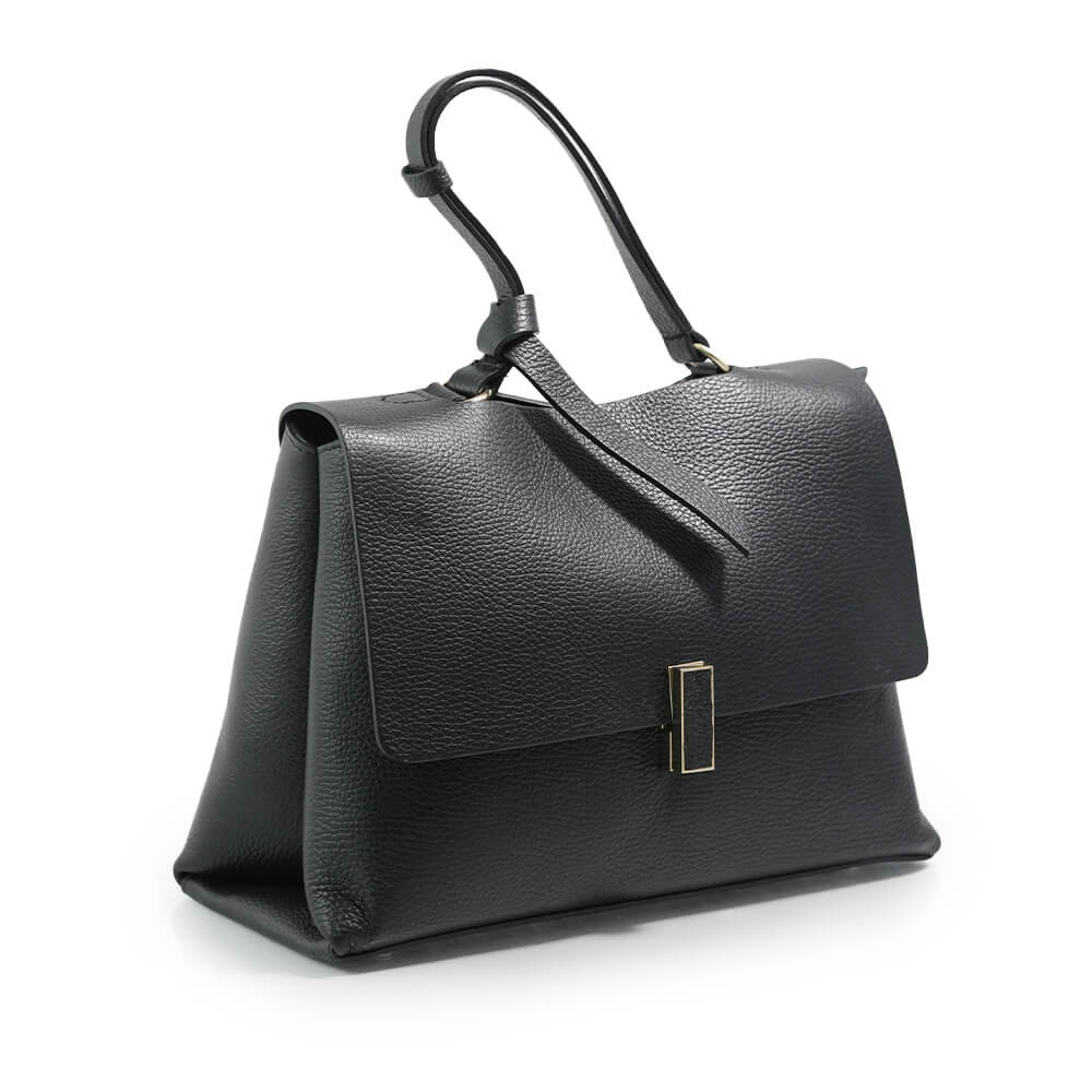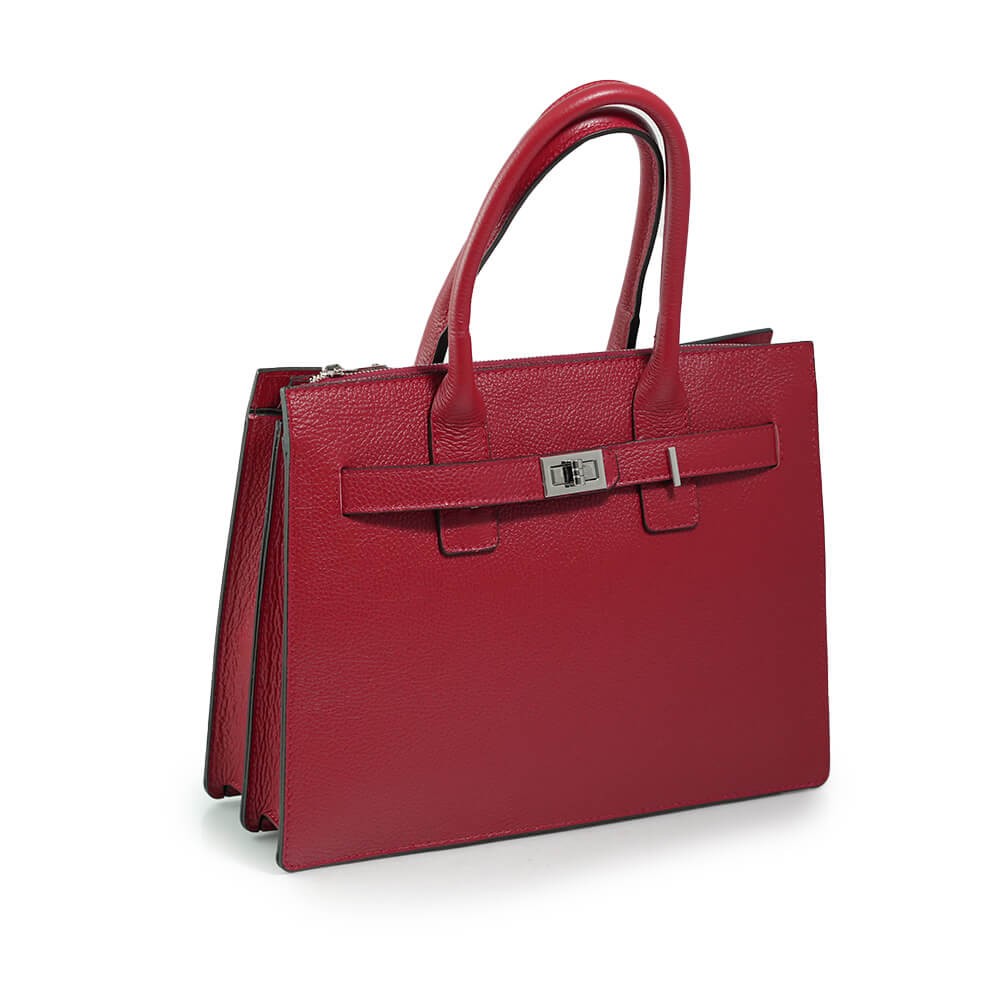 Geanta este prevazuta cu o curea din piele pentru a fi purtata in mana sau pe brat si o curea detasabila ce permite purtarea pe umar