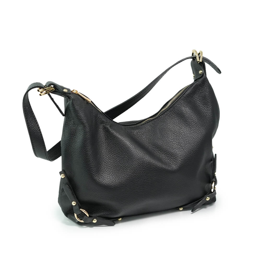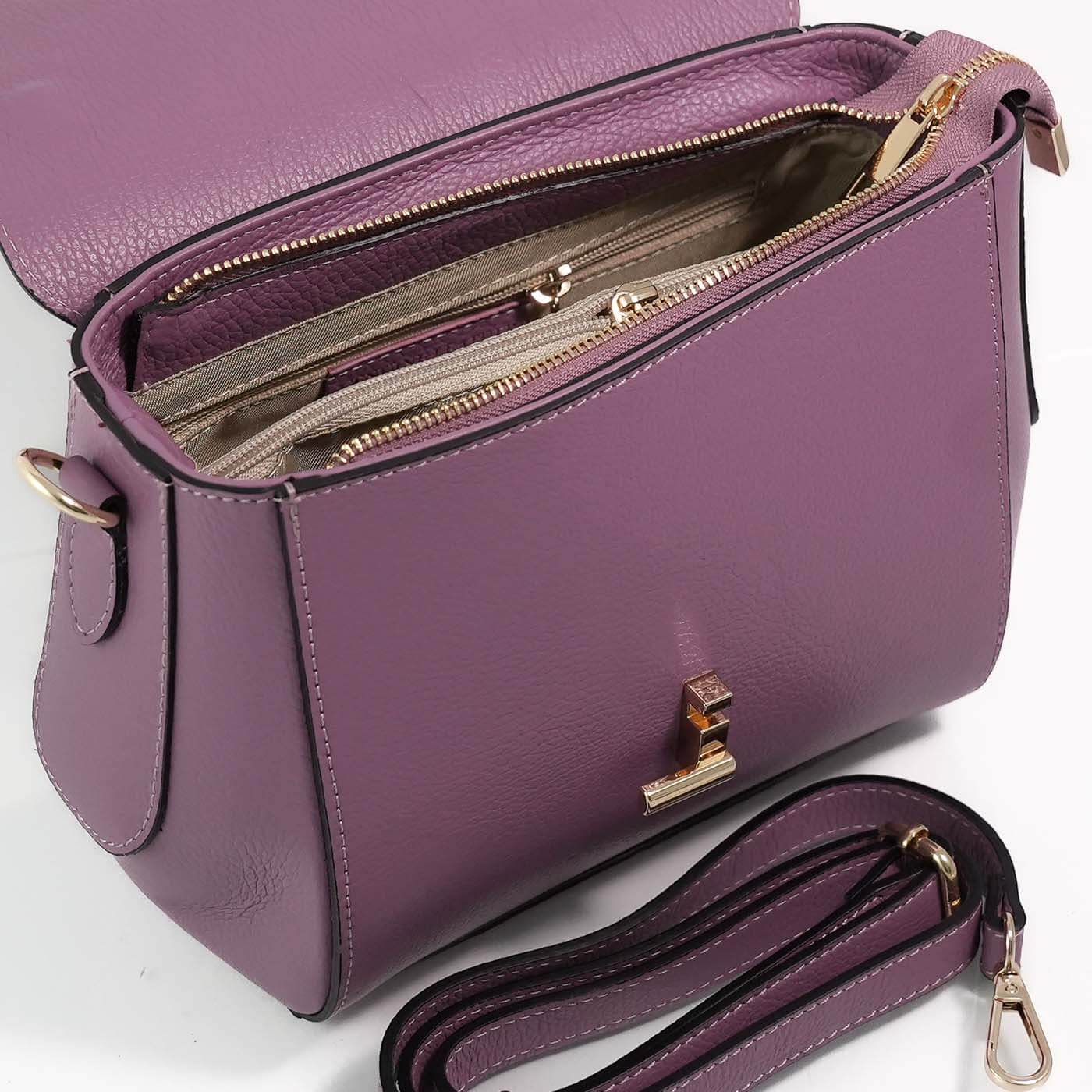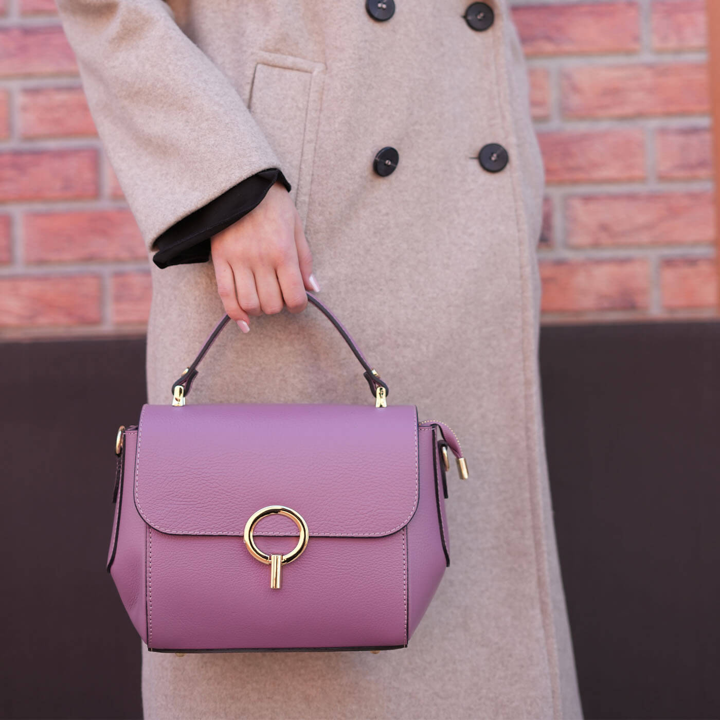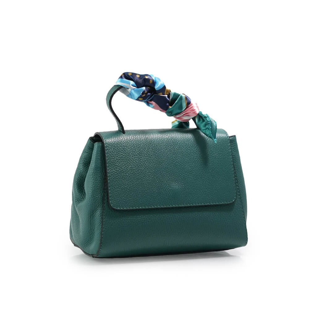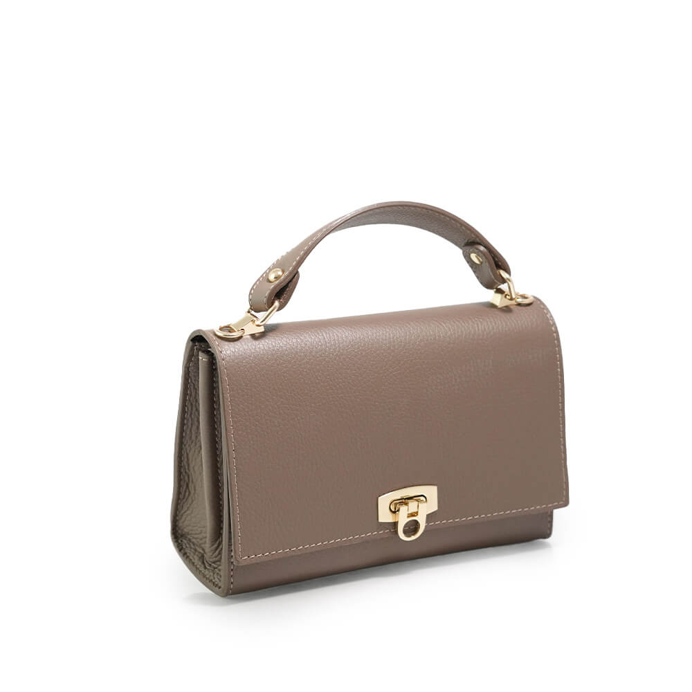 Geanta este prevazuta cu o curea din piele pentru a fi purtata in mana sau pe brat si o curea detasabila ce permite purtarea pe umar