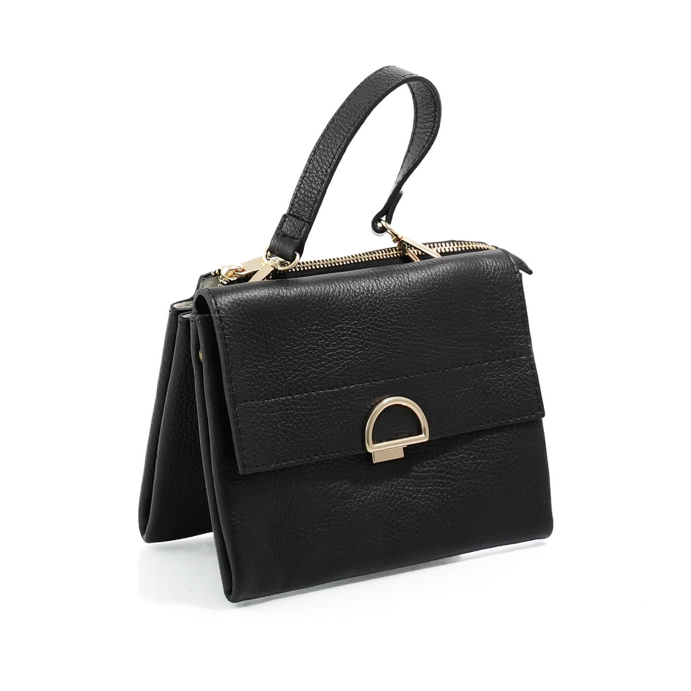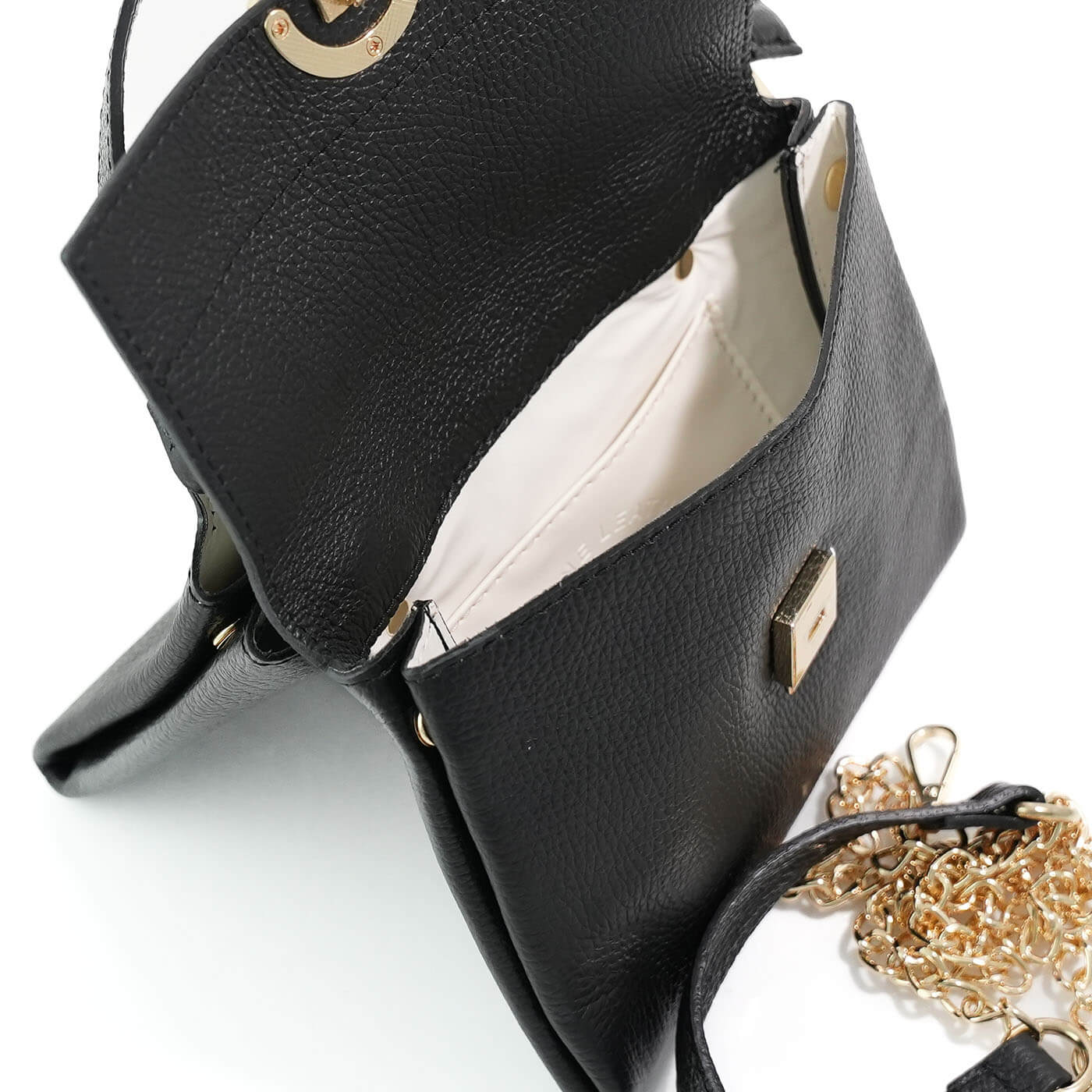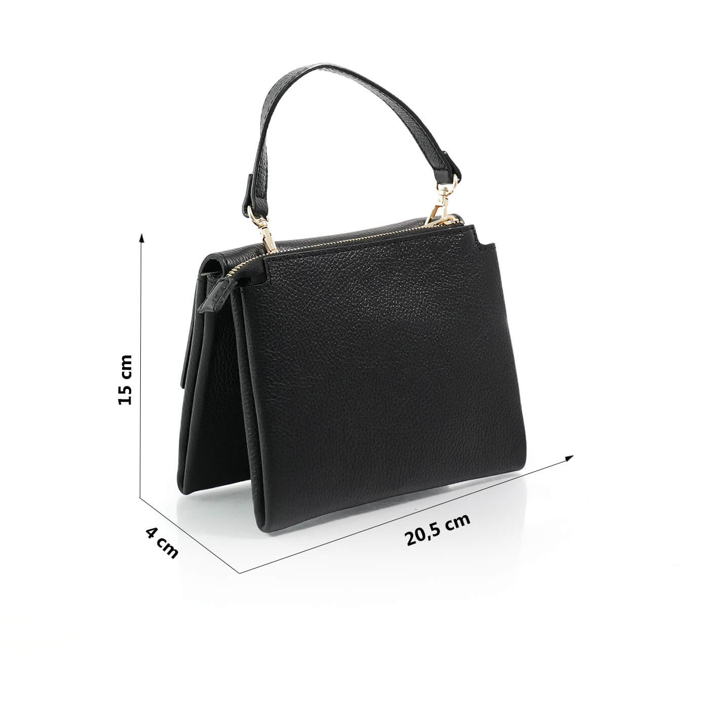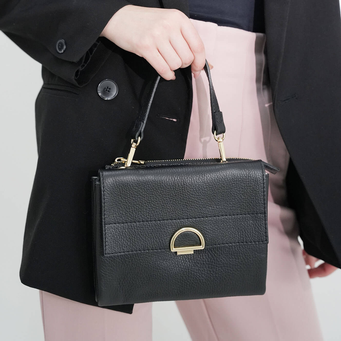 Geanta este prevazuta cu o curea din piele pentru a fi purtata in mana sau pe brat si o curea detasabila ce permite purtarea pe umar