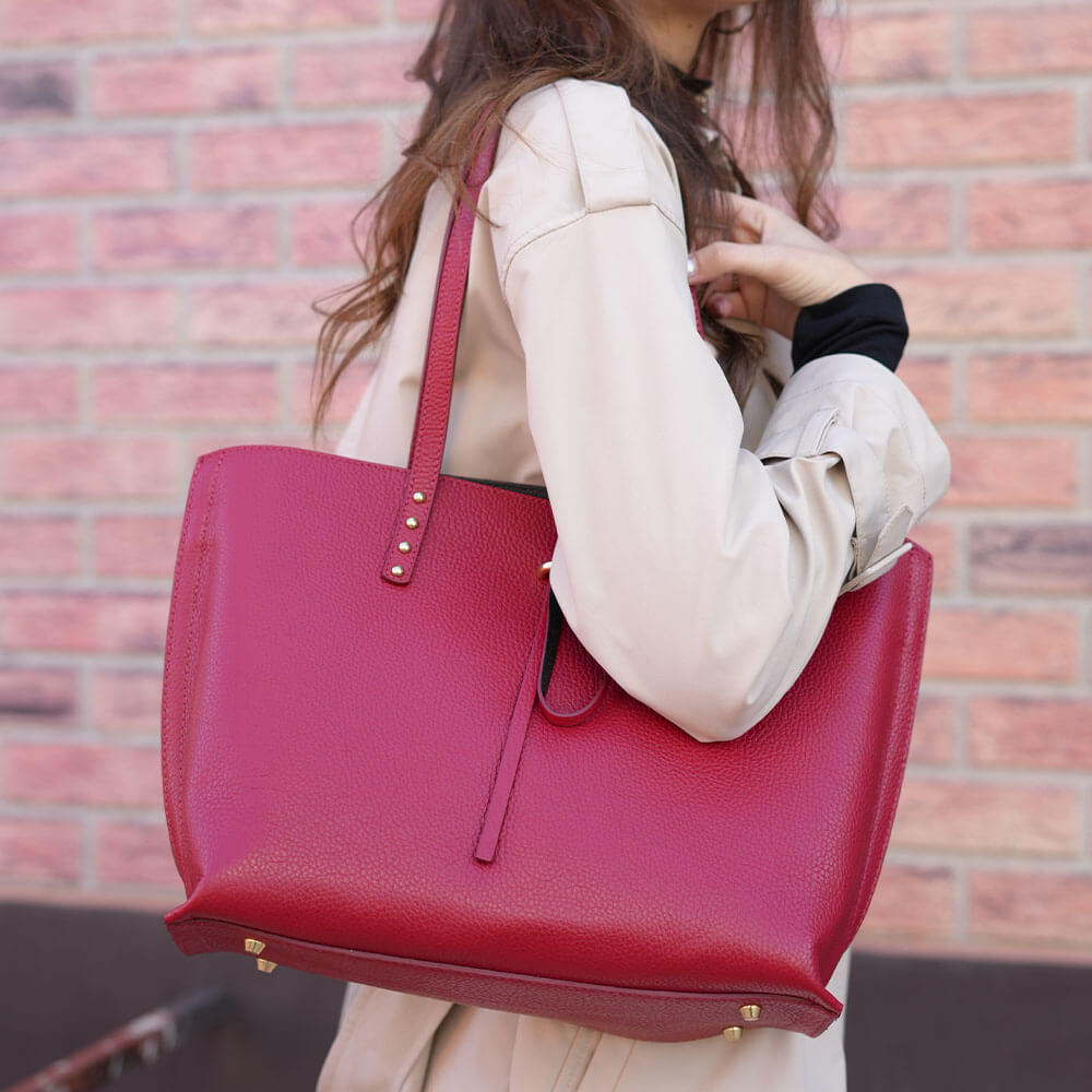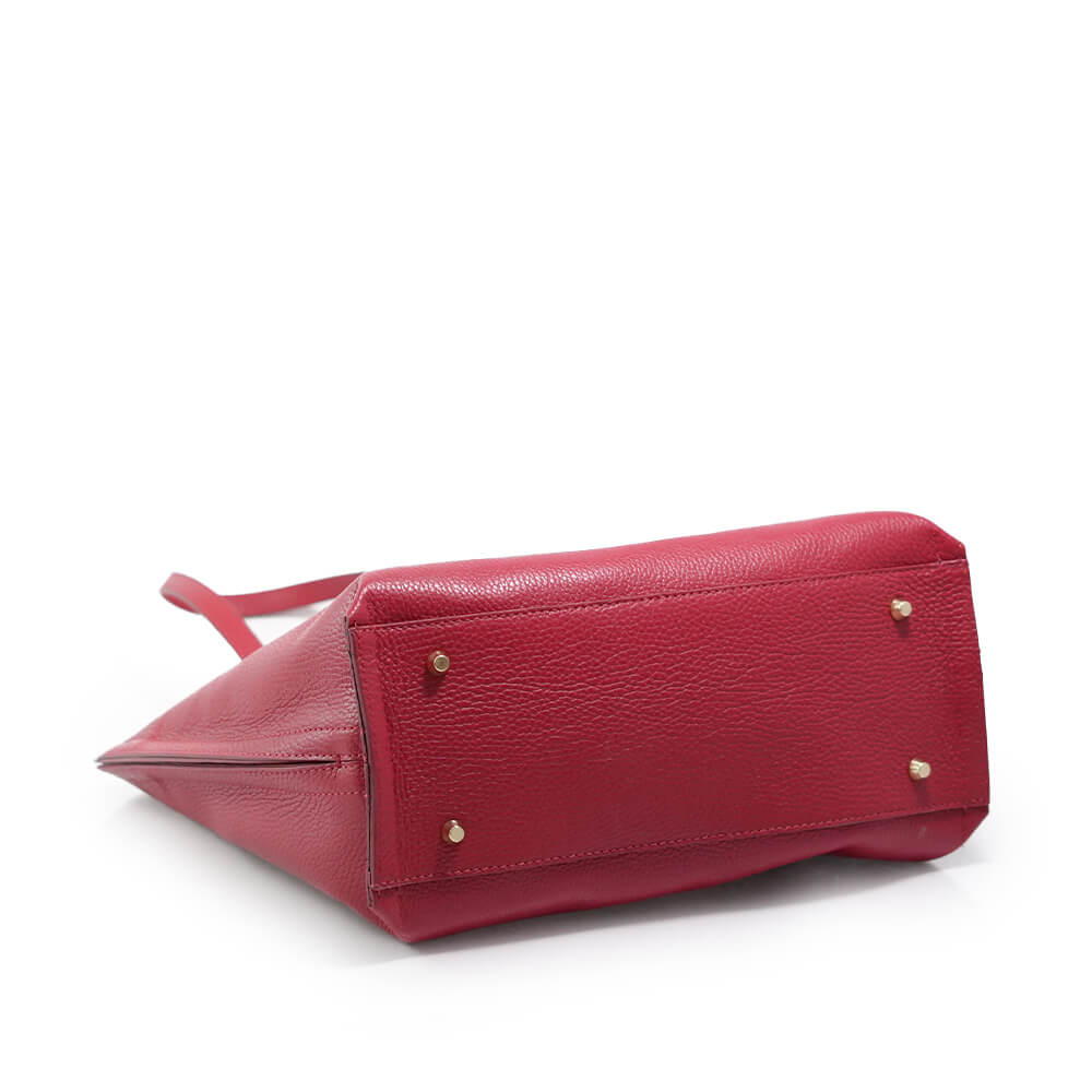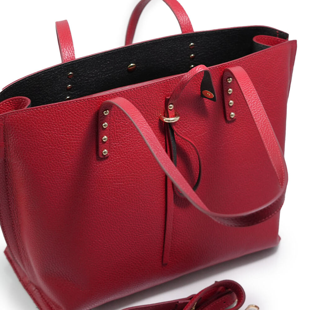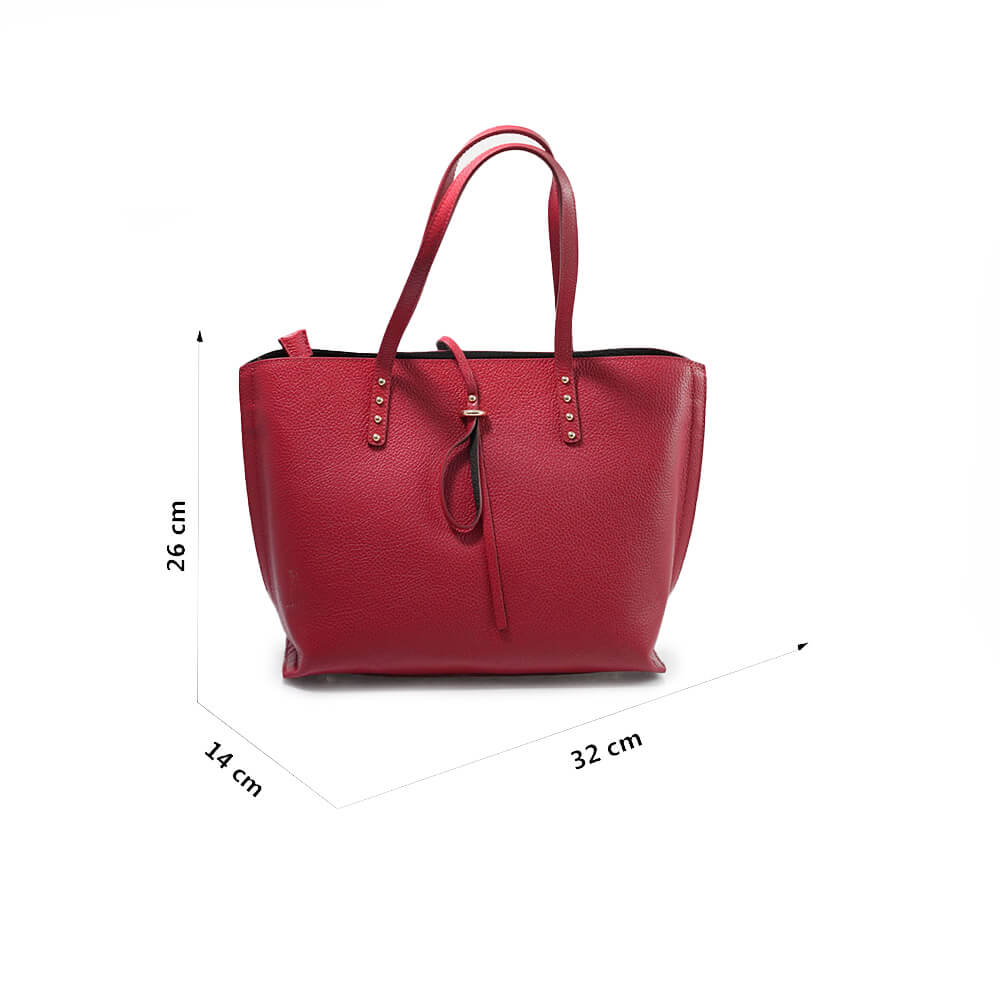 Geanta este prevazuta cu doua manere din piele pentru a fi purtata in mana si o curea detasabila de piele ce permite purtarea pe umar.