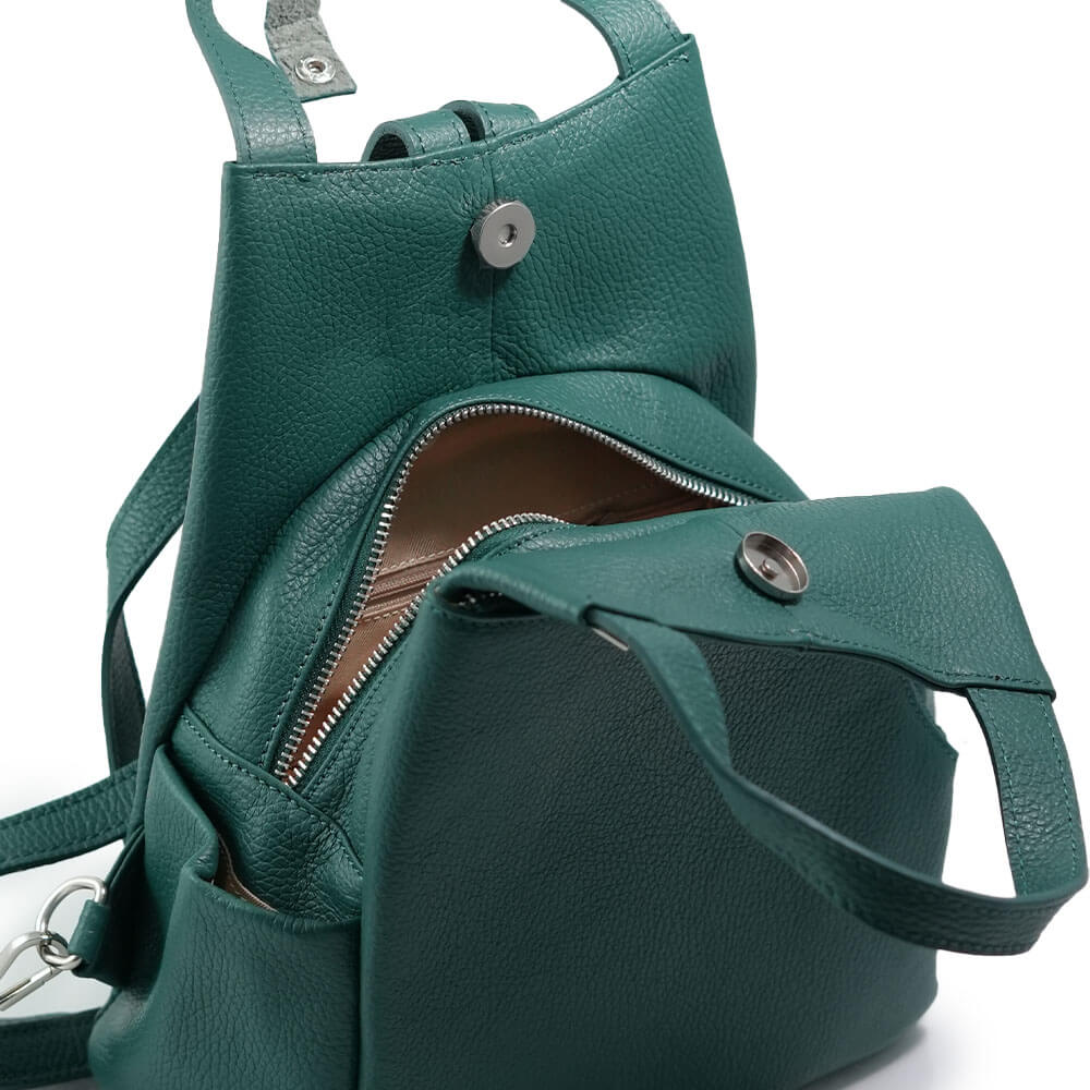 Rucsacul este prevazut cu doua barete din piele pentru a fi purtat in mana sau pe brat si doua barete de umar reglabile.