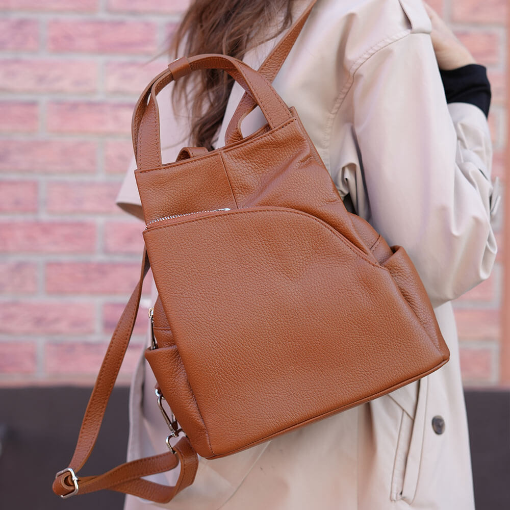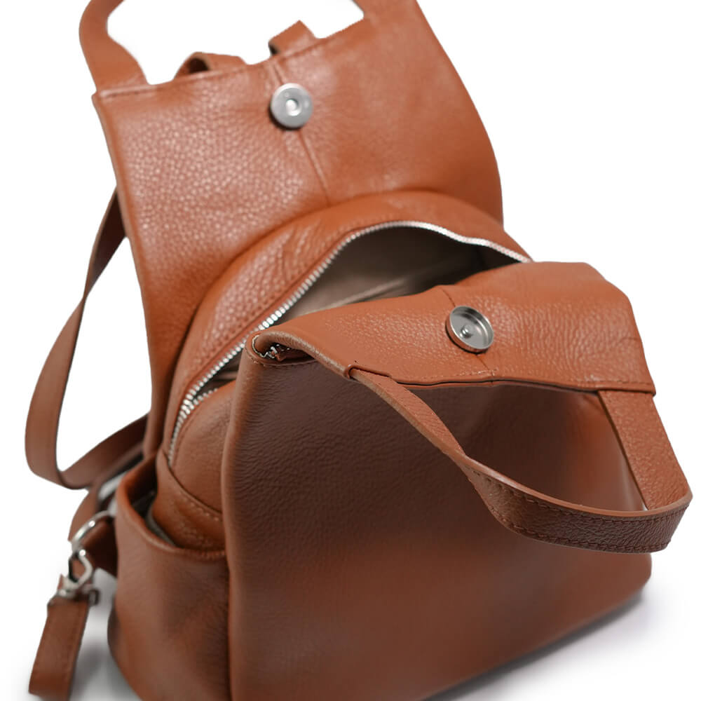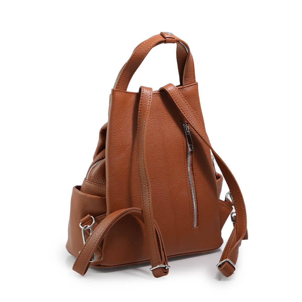 Rucsacul este prevazut cu doua barete din piele pentru a fi purtat in mana sau pe brat si doua barete de umar reglabile.