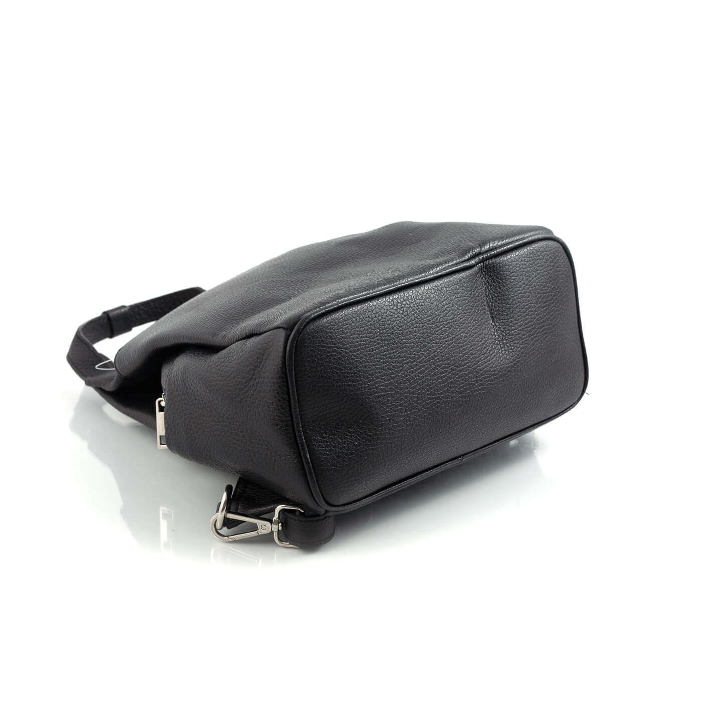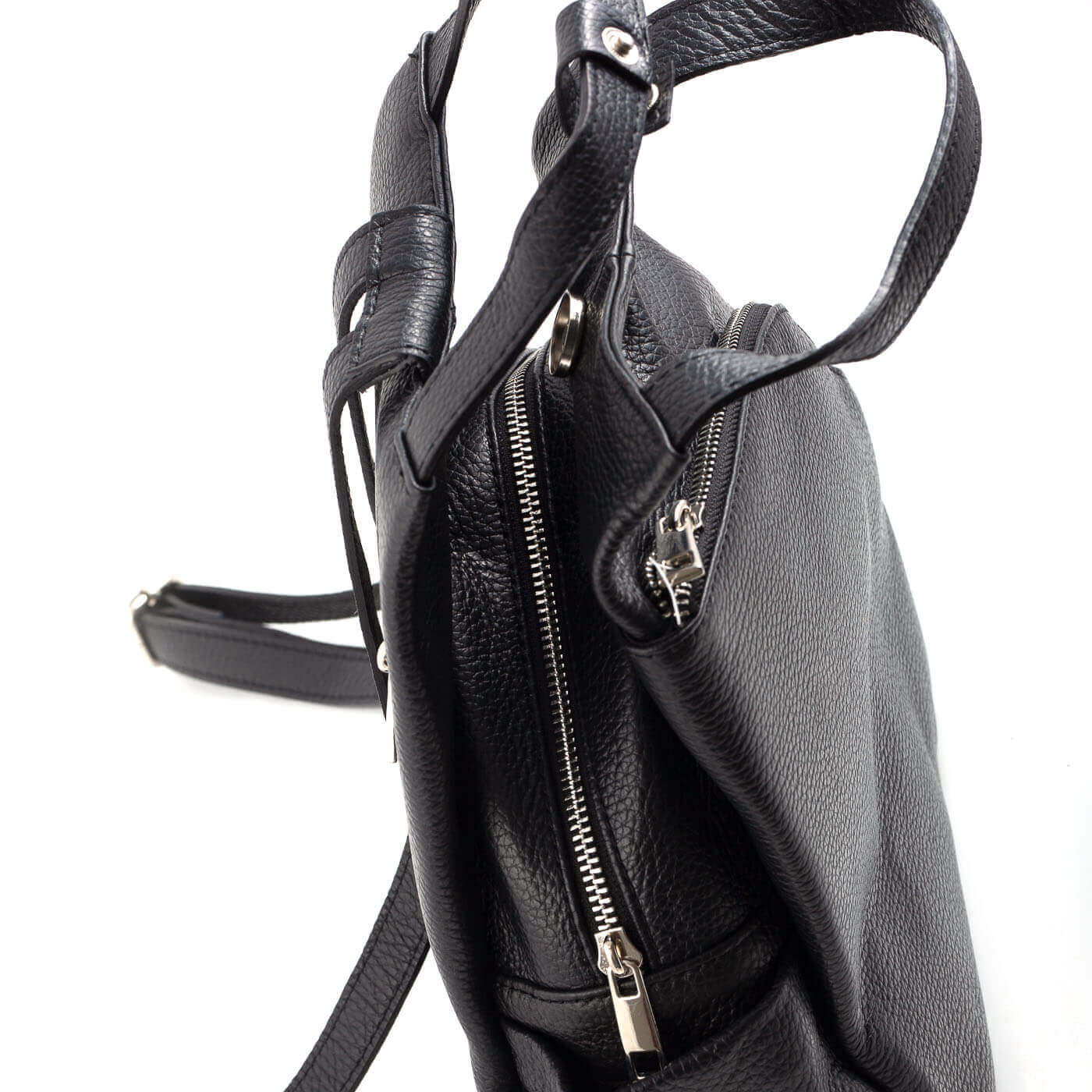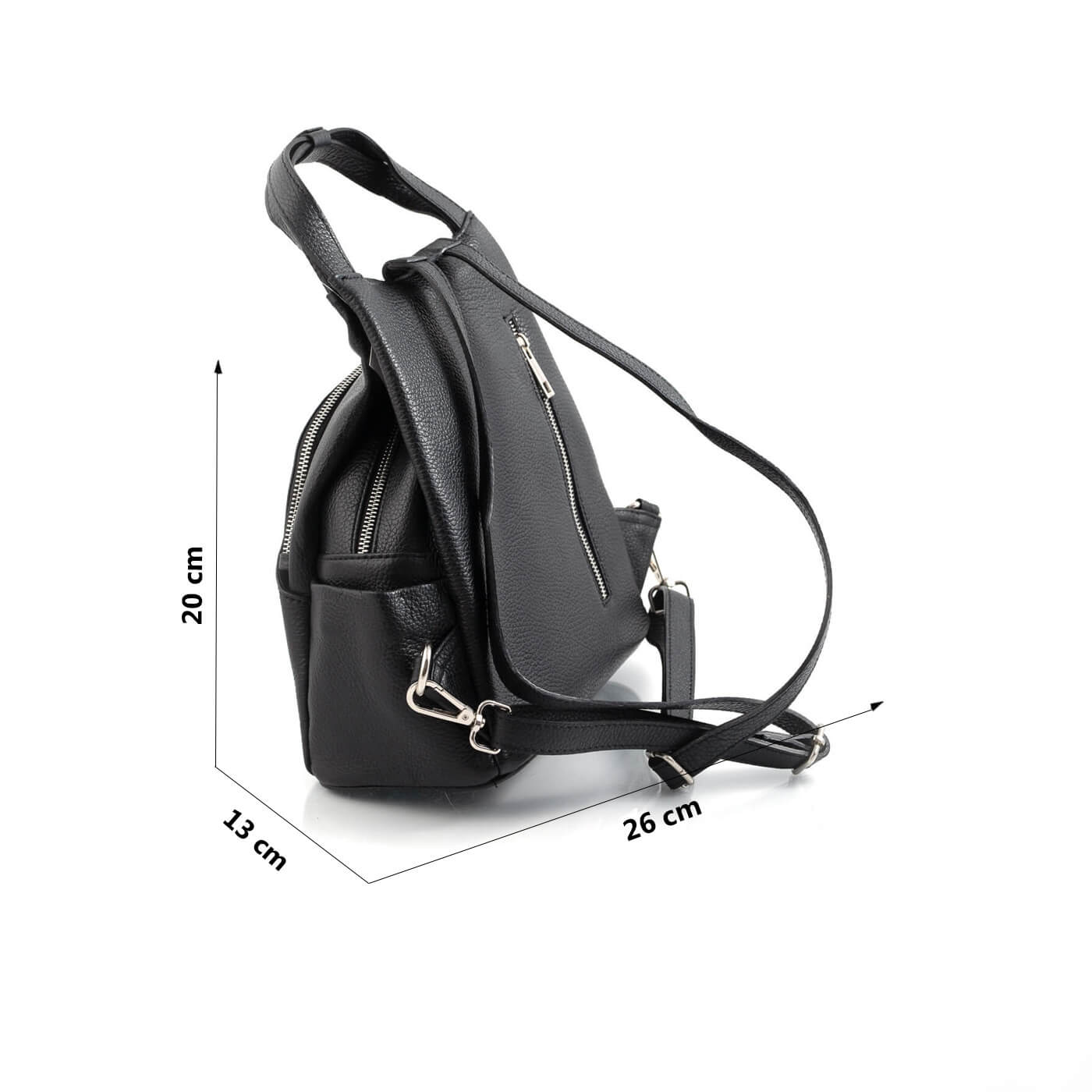 Rucsacul este prevazut cu doua barete din piele pentru a fi purtat in mana sau pe brat si doua barete de umar reglabile.