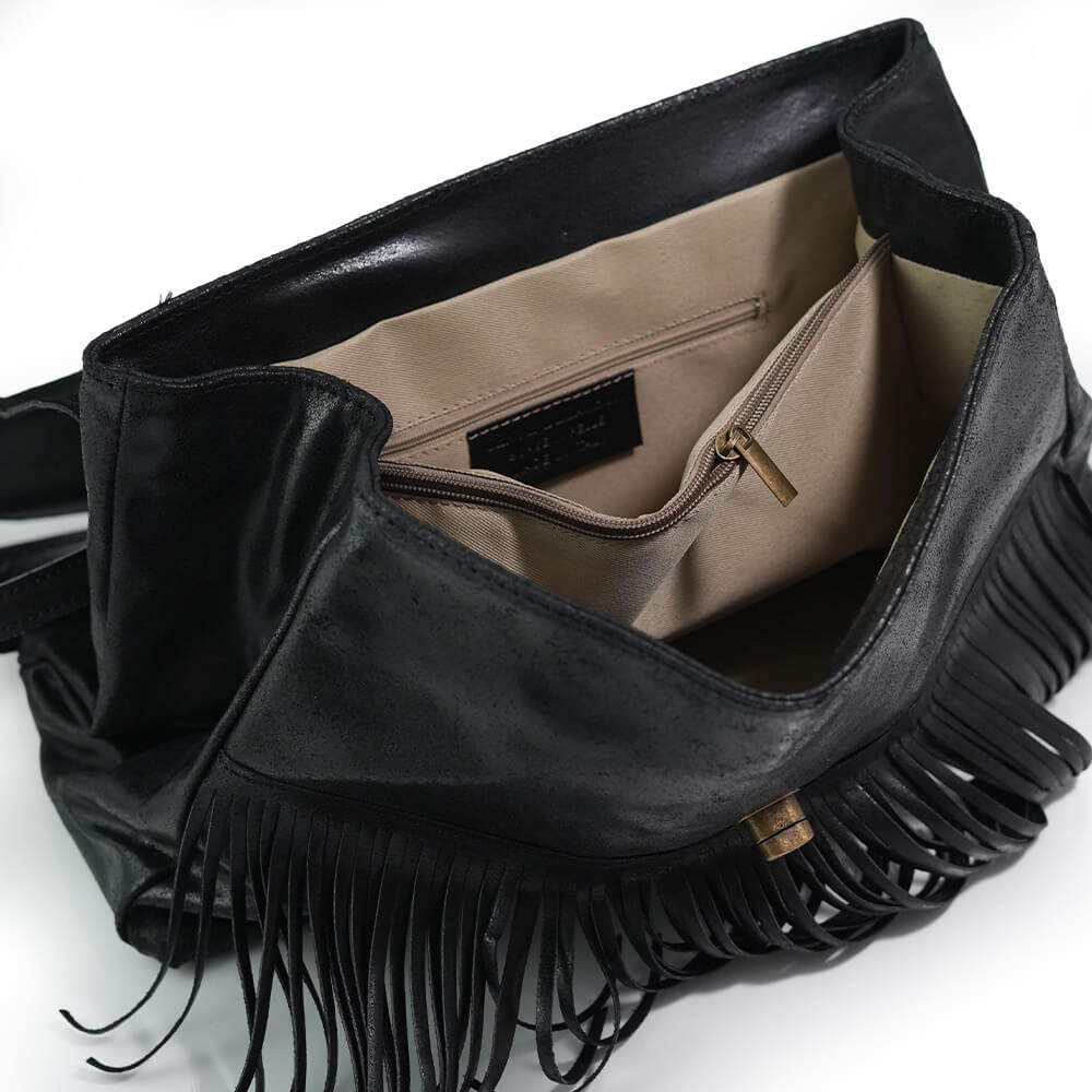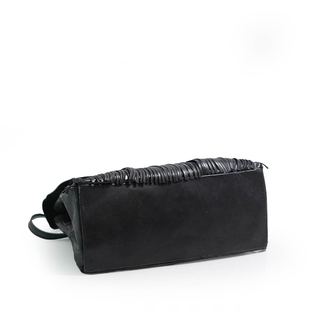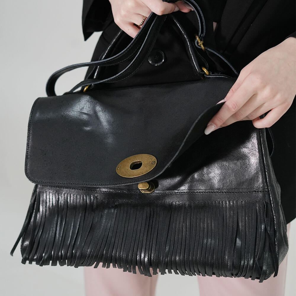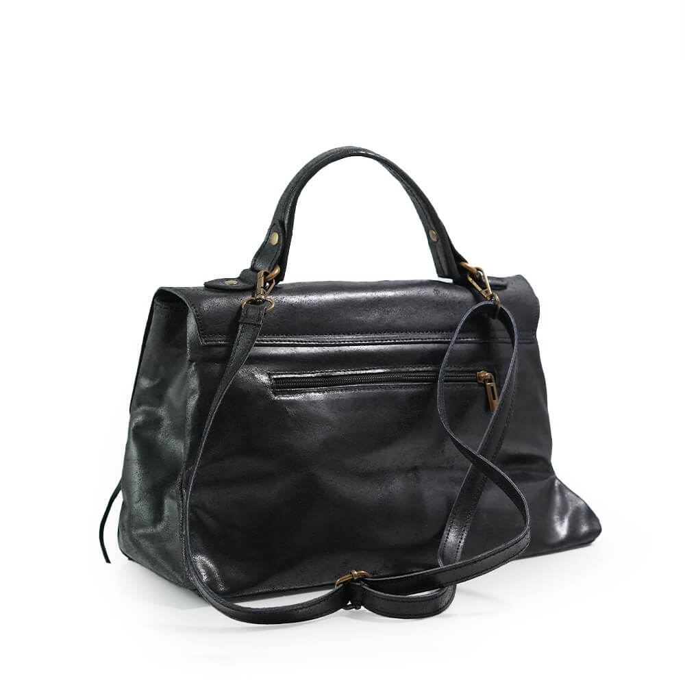 Geanta este prevazuta cu o curea din piele pentru a fi purtata in mana sau pe brat si o curea detasabila ce permite purtarea pe umar.