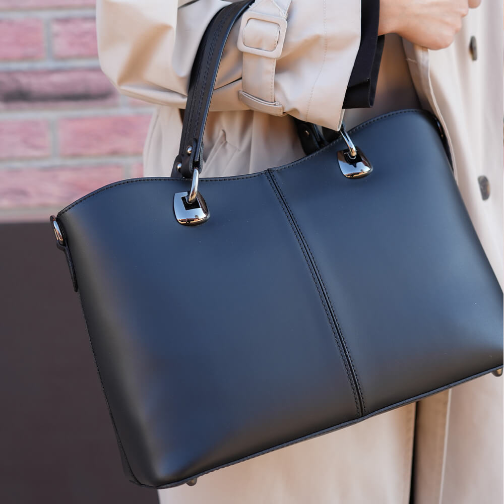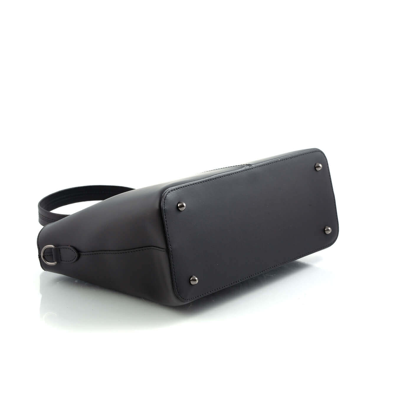 Geanta este prevazuta cu doua cureluse din piele pentru a fi purtata in mana si o curea detasabila ce permite purtarea si pe umar.