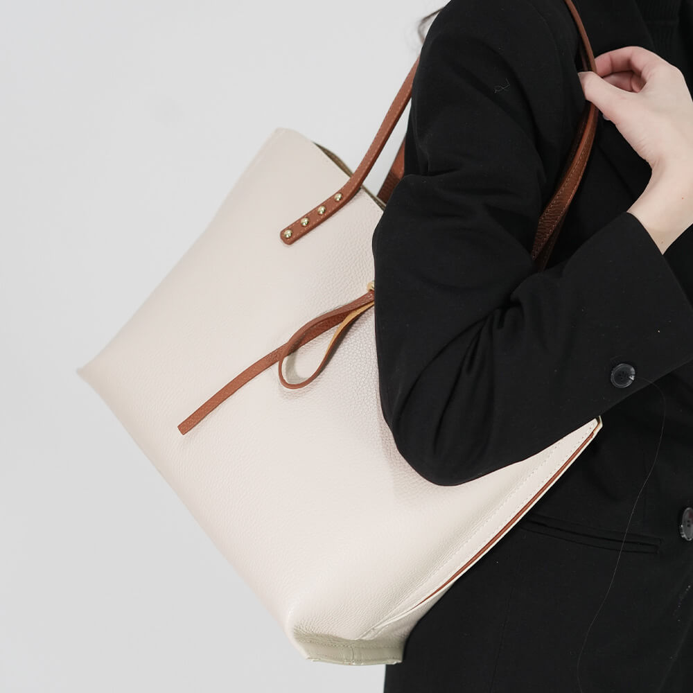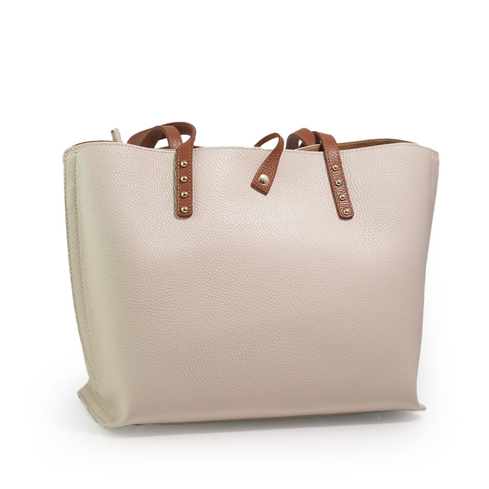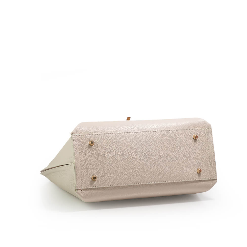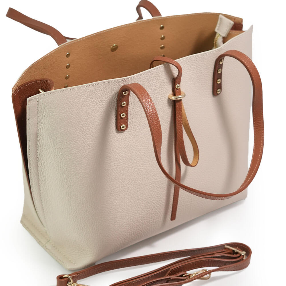 Geanta este prevazuta cu doua manere din piele pentru a fi purtata in mana si o curea detasabila de piele ce permite purtarea pe umar.