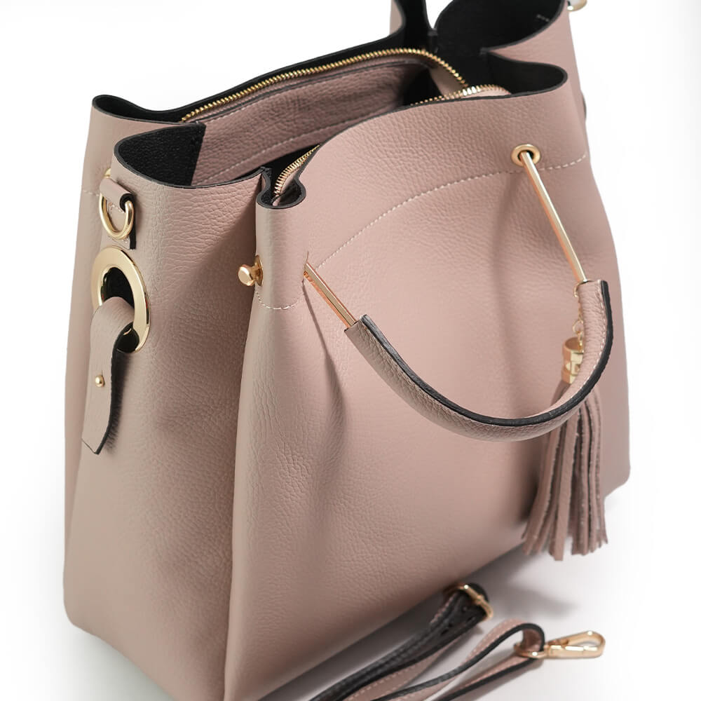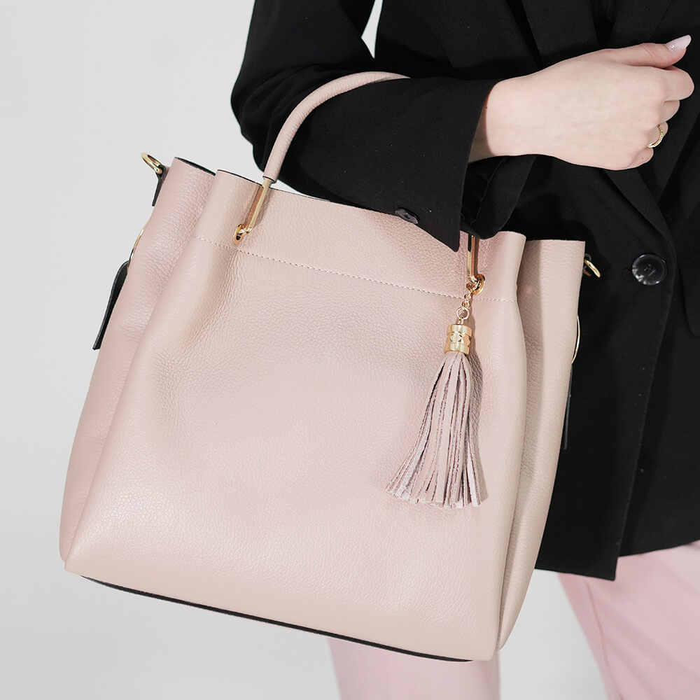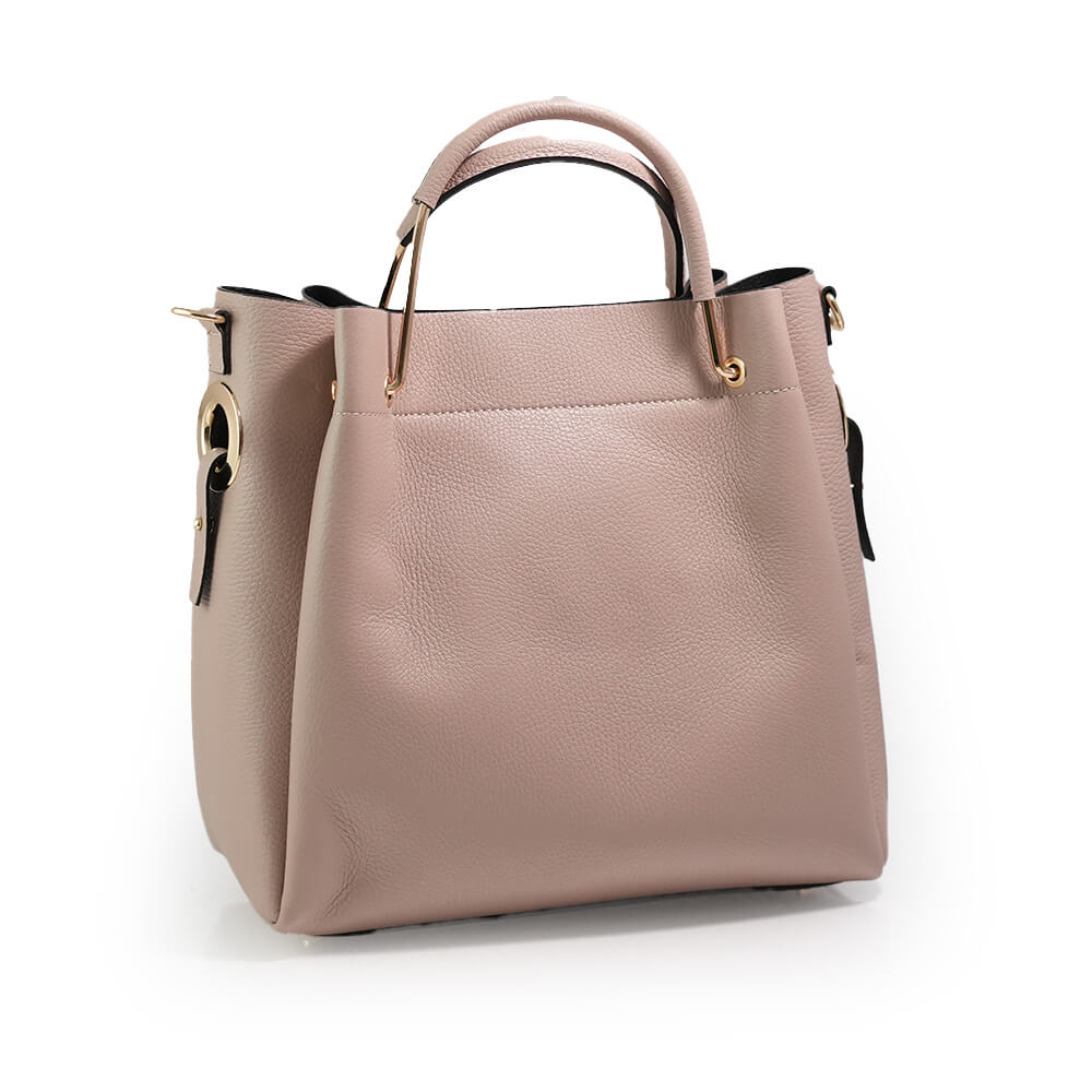 Geanta este prevazuta cu o curea din piele pentru a fi purtata in mana sau pe brat si o curea detasabila ce permite purtarea pe umar.