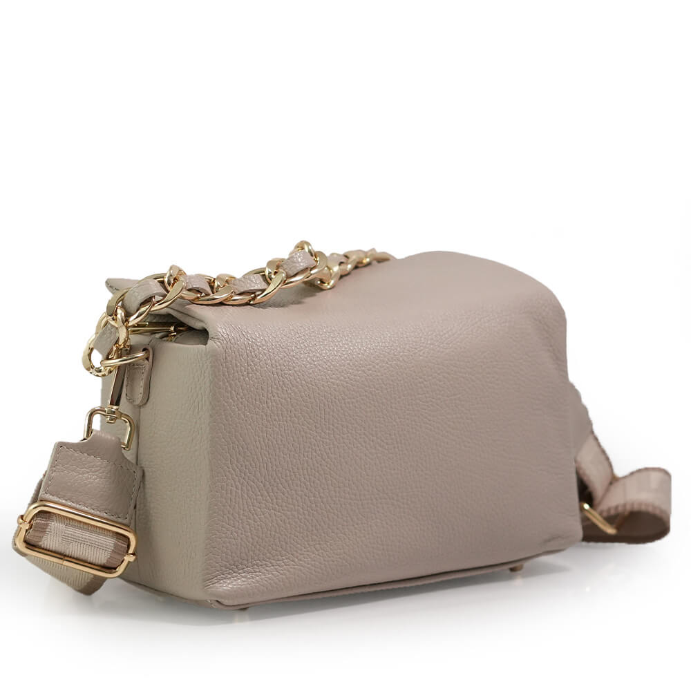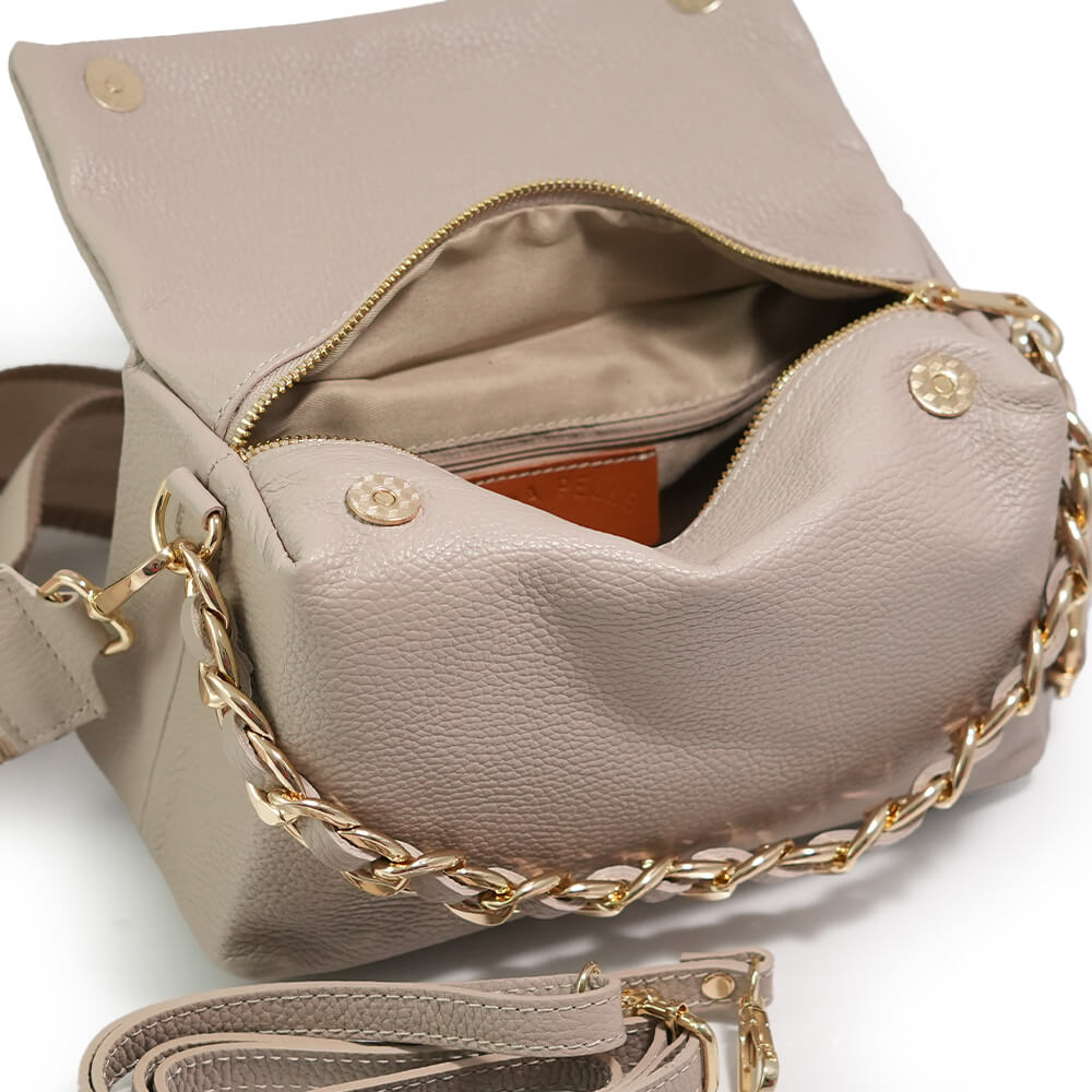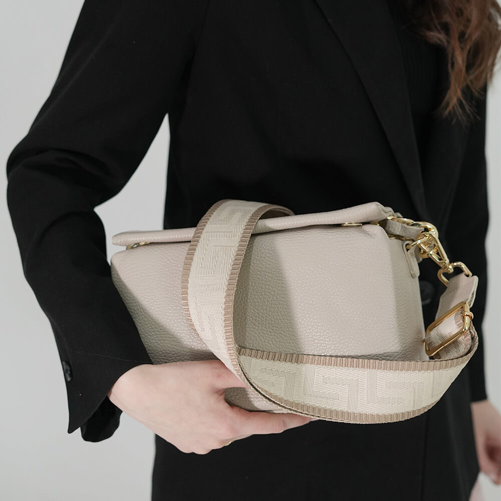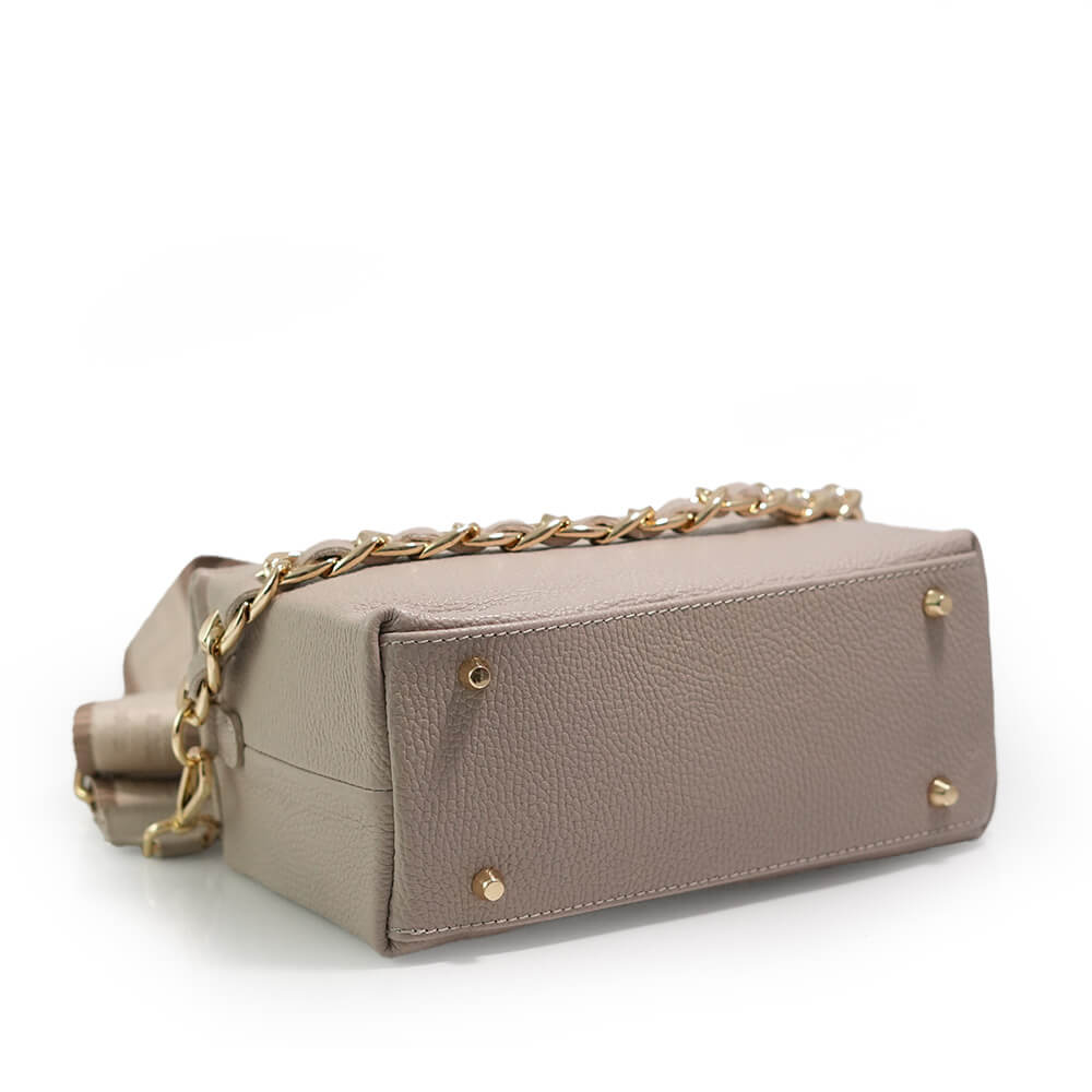 Geanta este prevazuta cu o bareta metalica pentru a fi purtata in mana sau pe brat si o curea detasabila ce permite purtarea pe umar