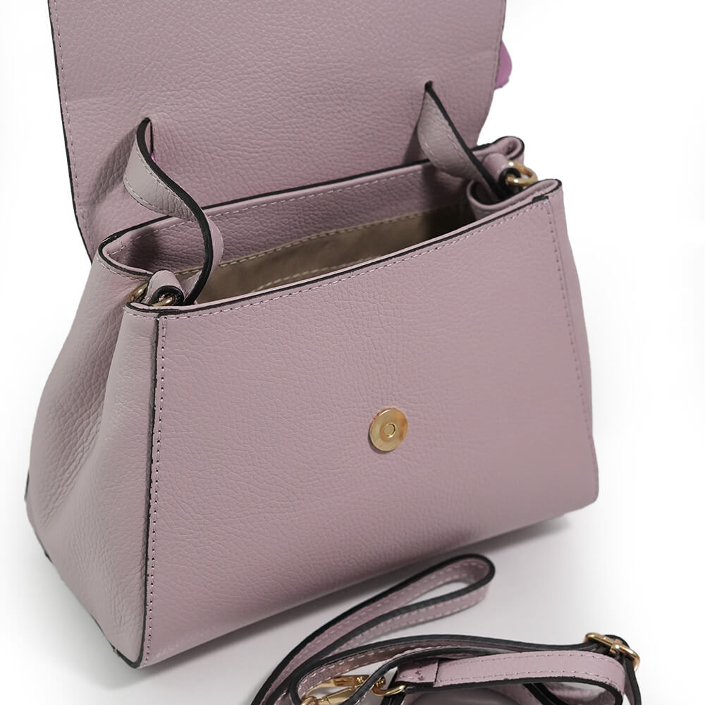 Geanta este prevazuta cu o curea din piele pentru a fi purtata in mana sau pe brat si o curea detasabila ce permite purtarea pe umar