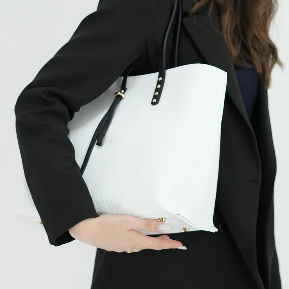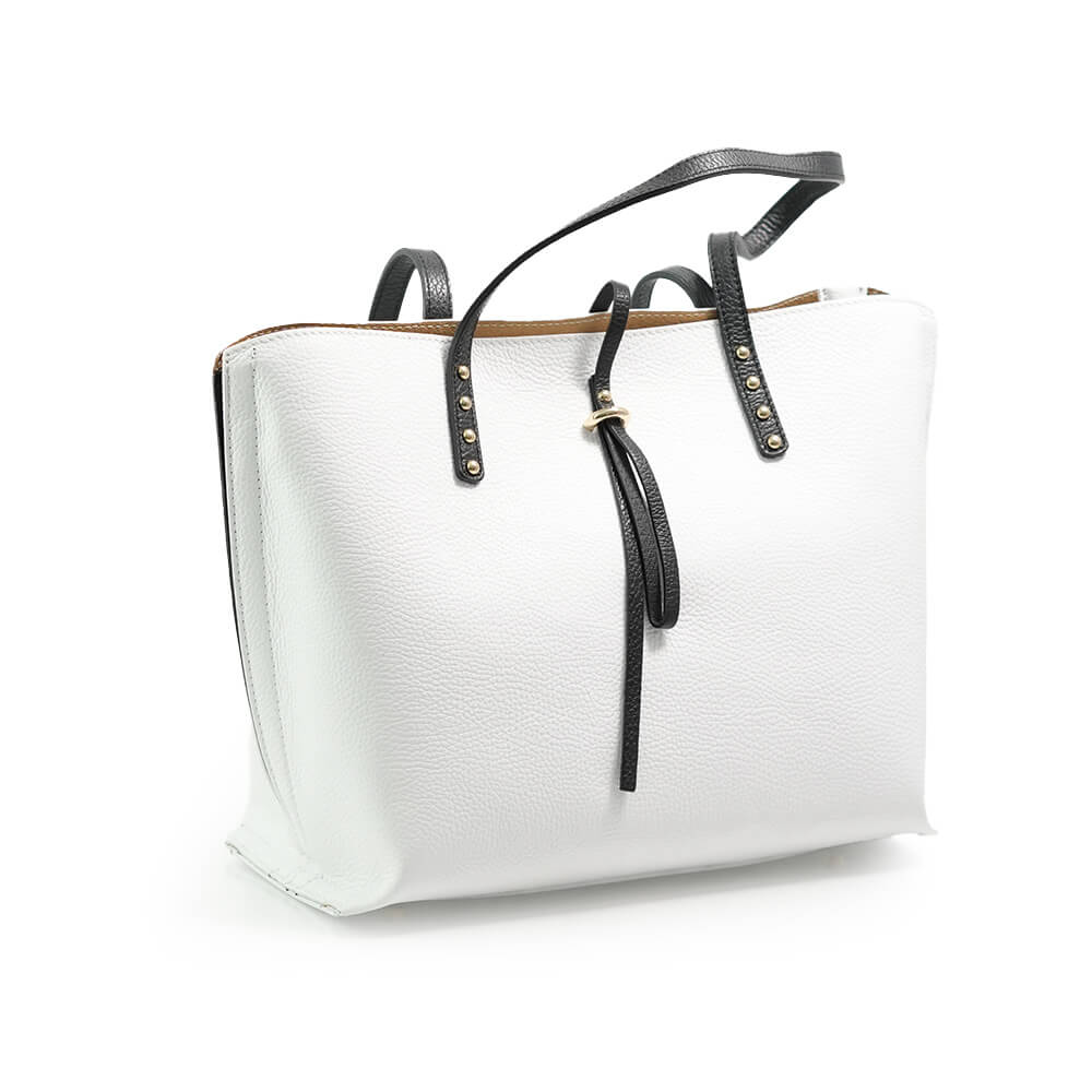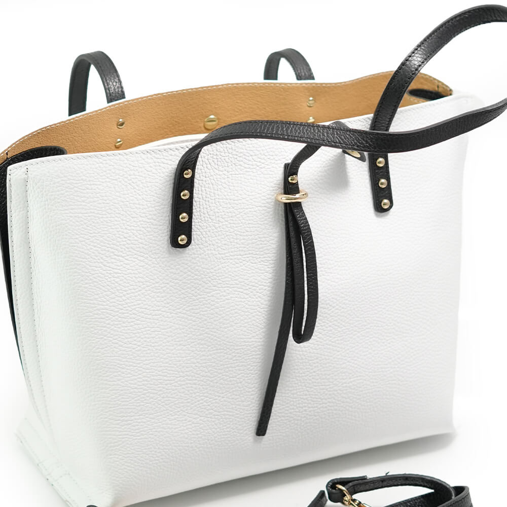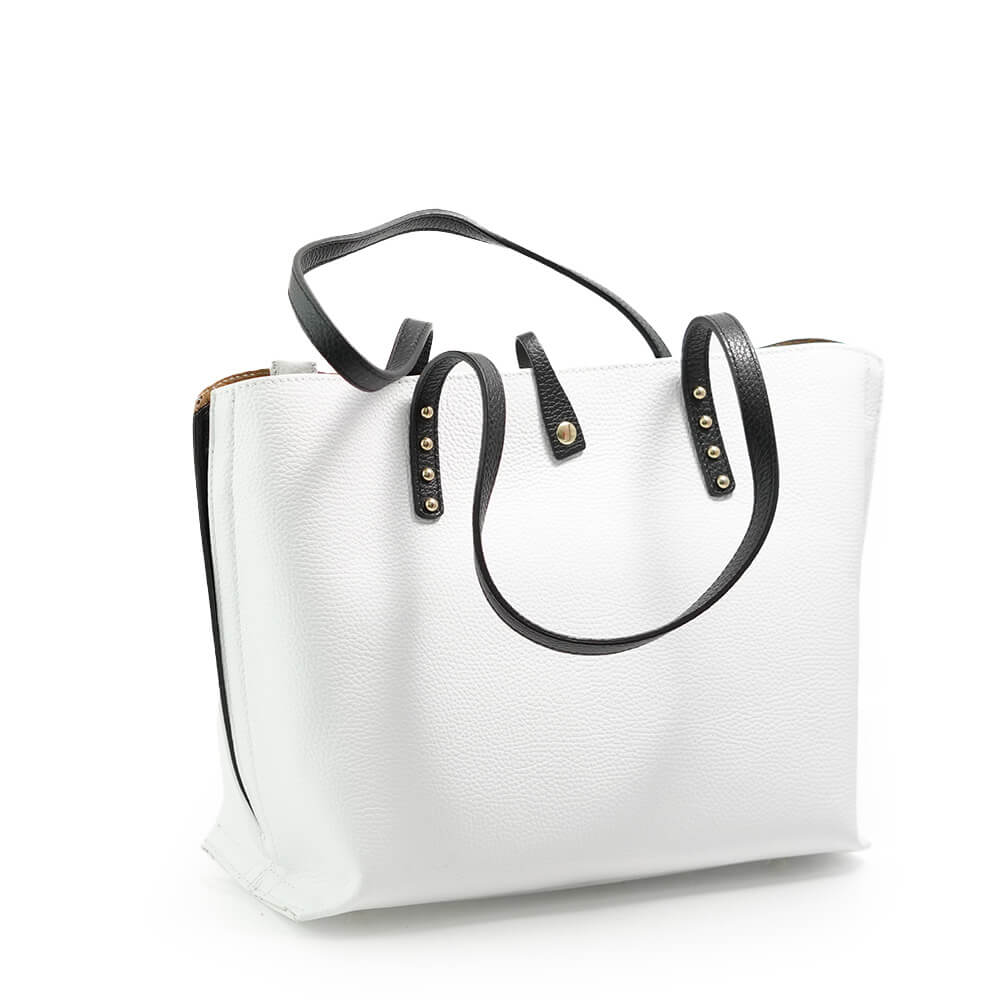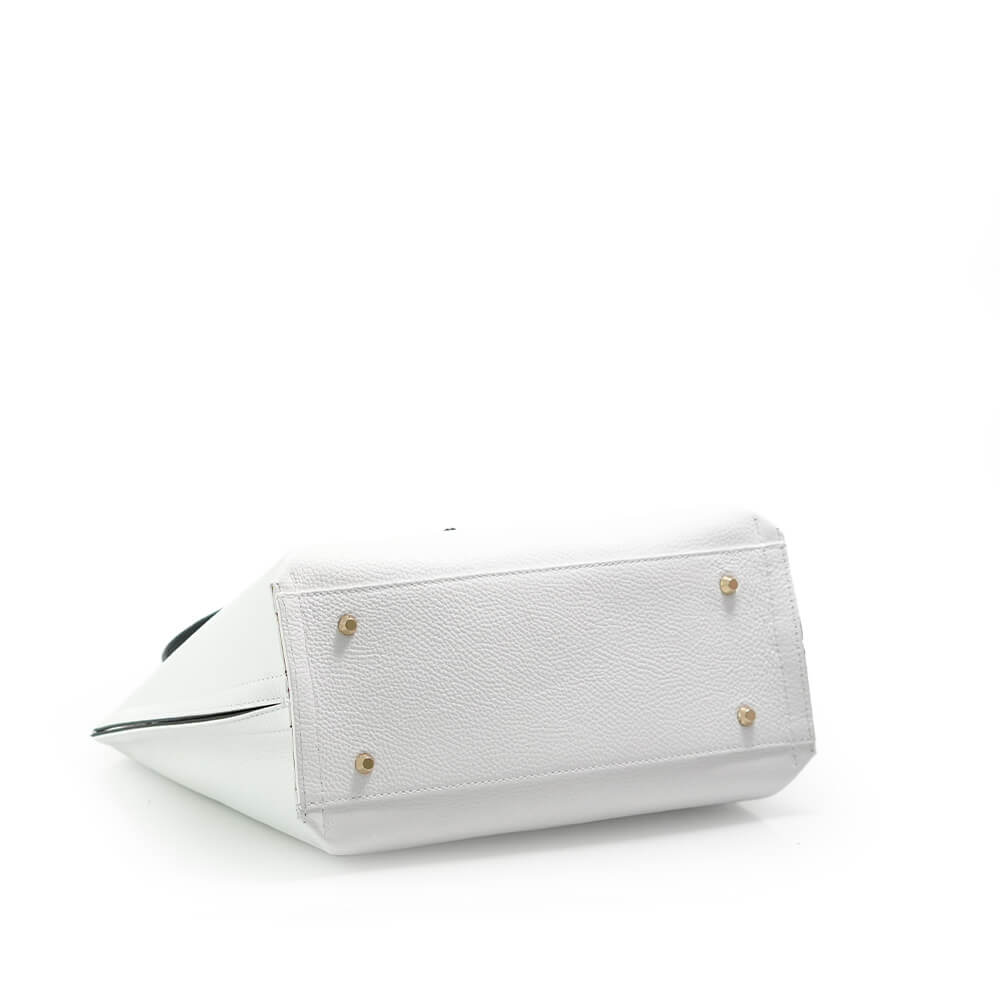 Geanta este prevazuta cu doua manere din piele pentru a fi purtata in mana si o curea detasabila de piele ce permite purtarea pe umar.