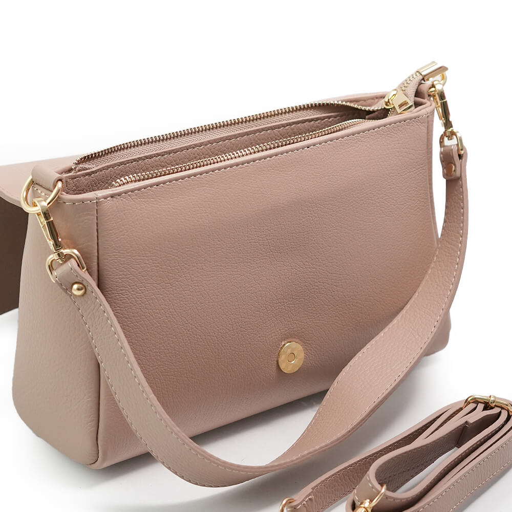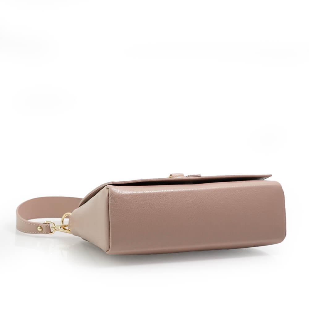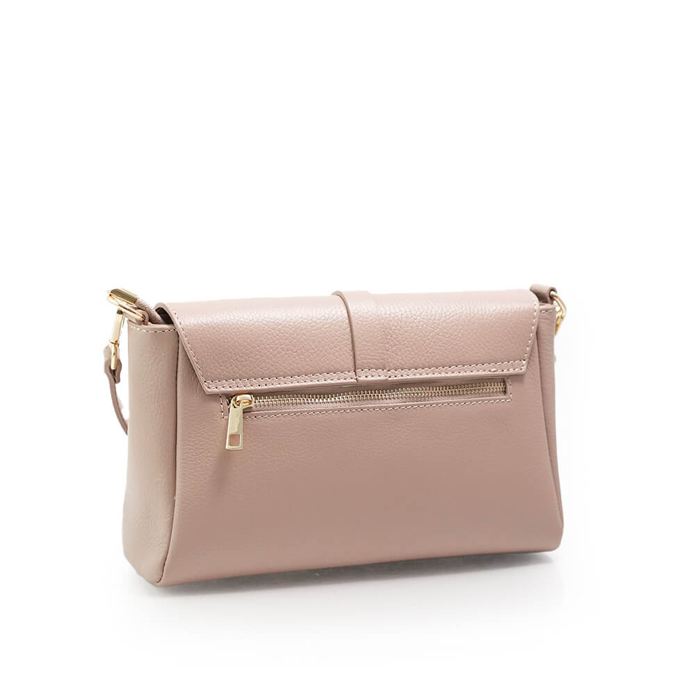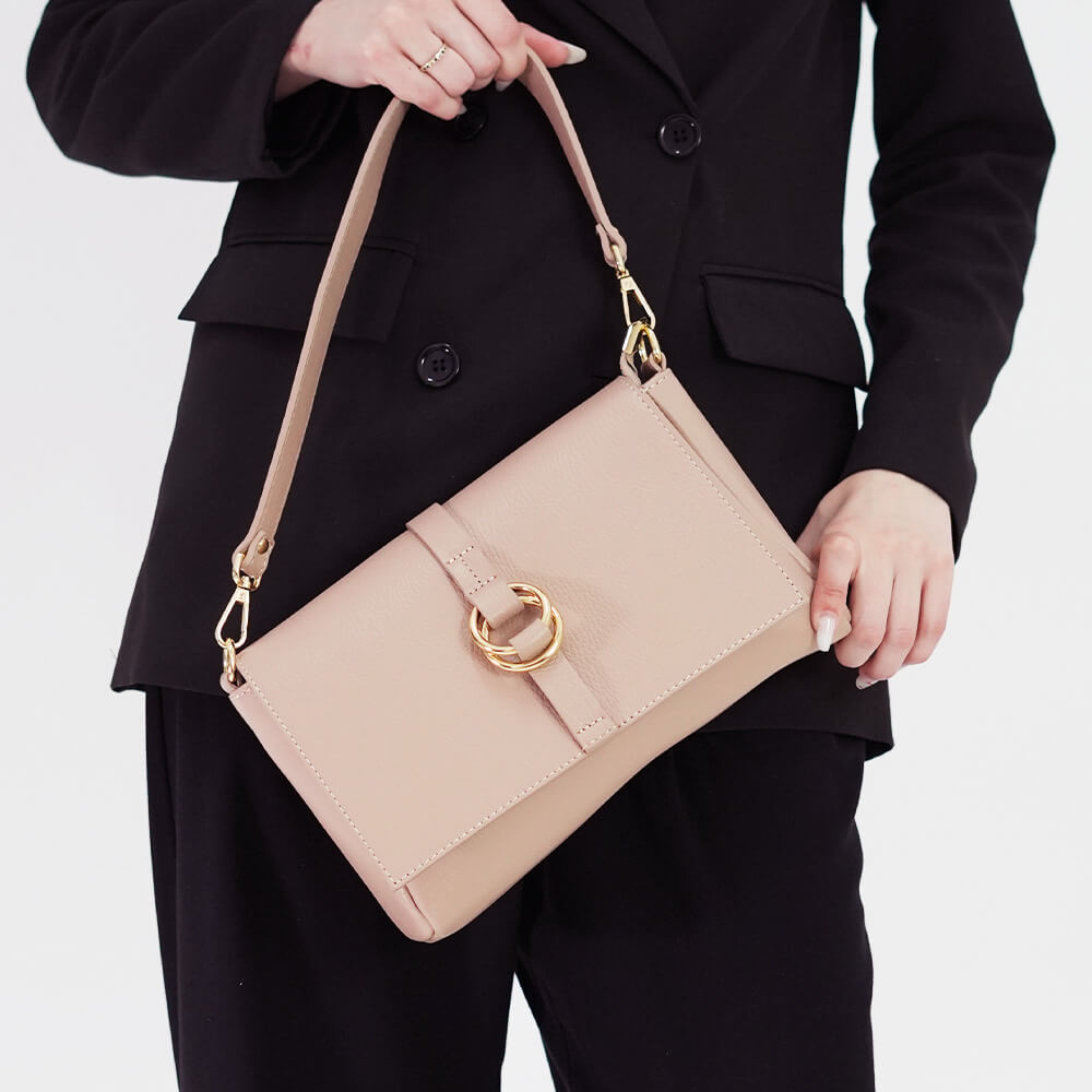 Geanta este prevazuta cu o curea din piele pentru a fi purtata in mana sau pe brat si o curea detasabila ce permite purtarea pe umar