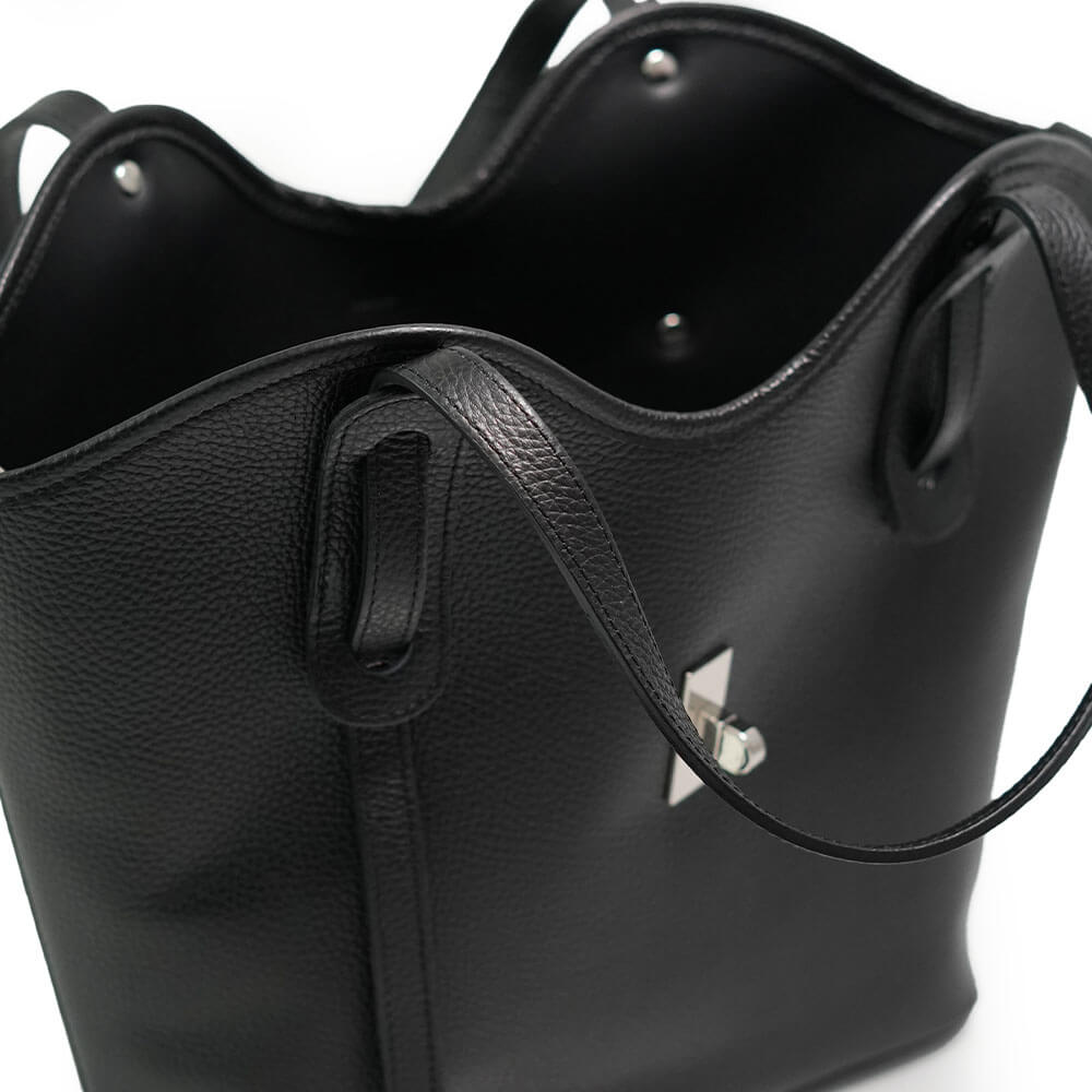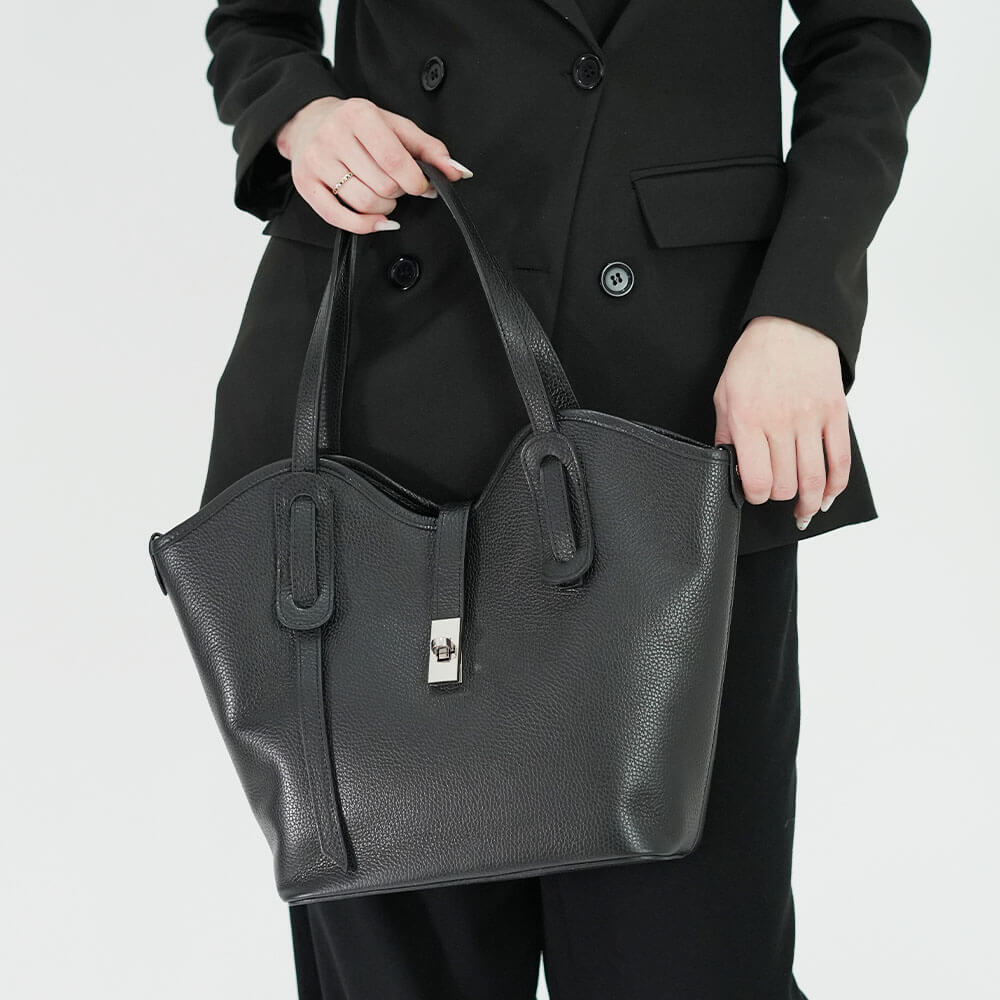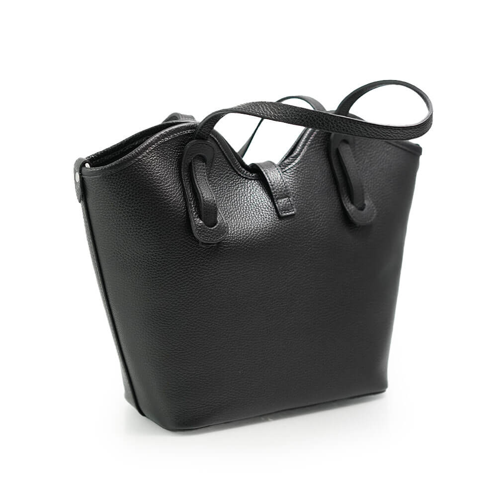 Geanta este prevazuta cu doua manere din piele pentru a fi purtata in mana