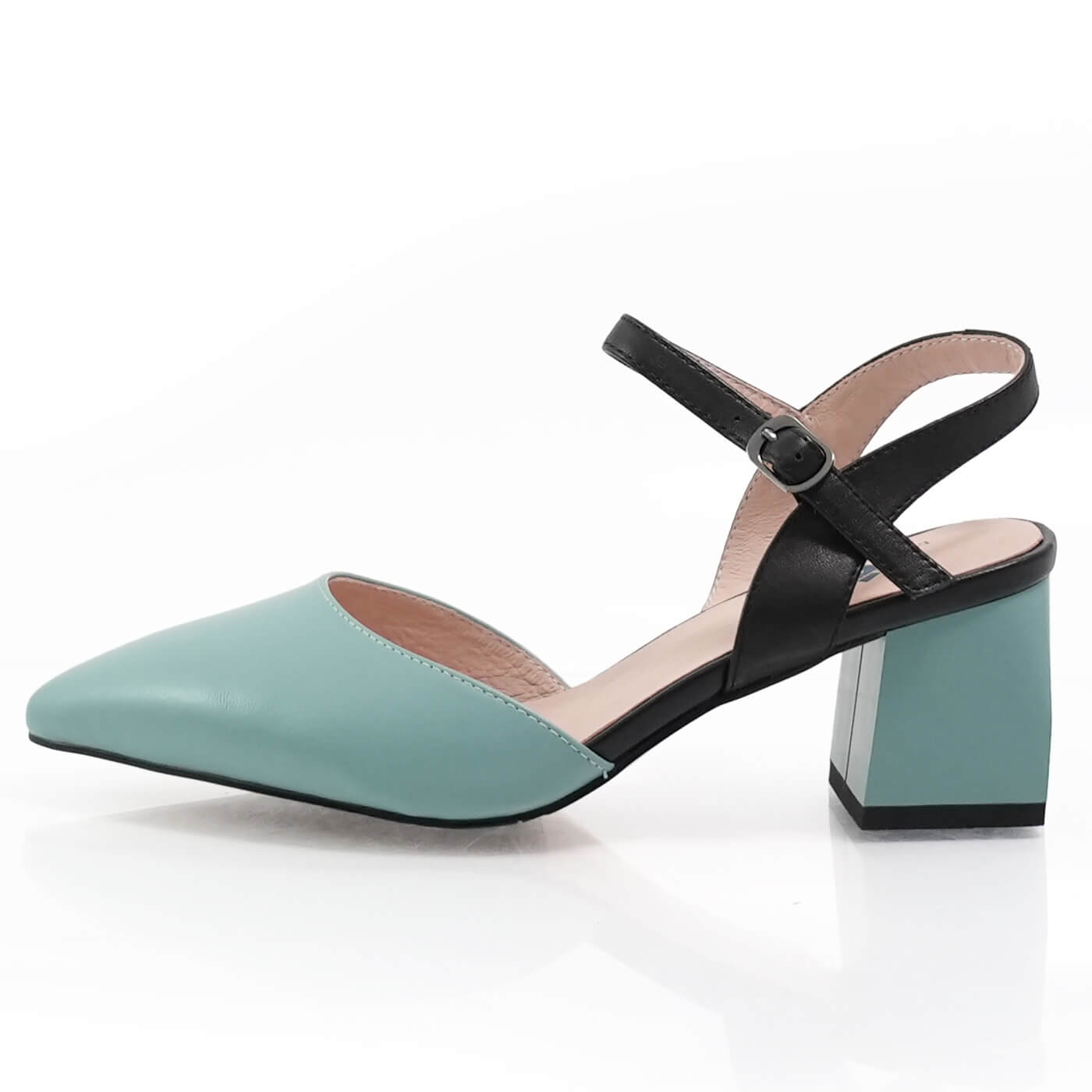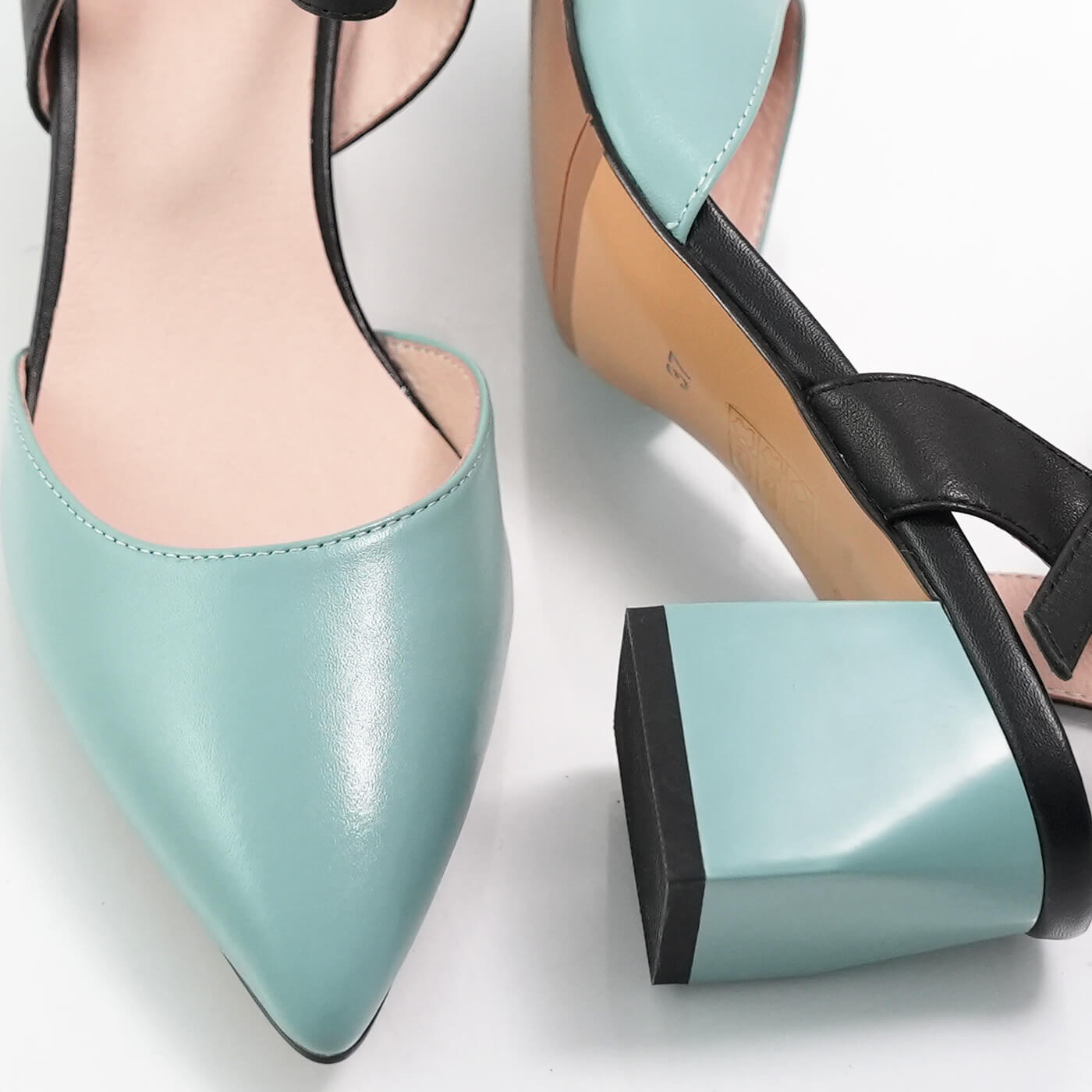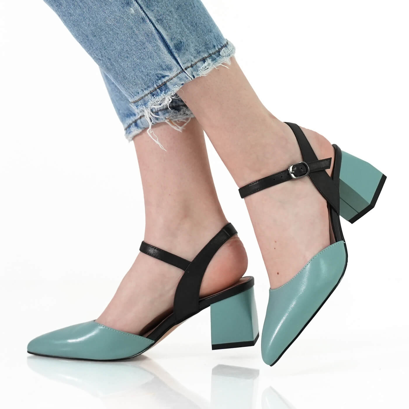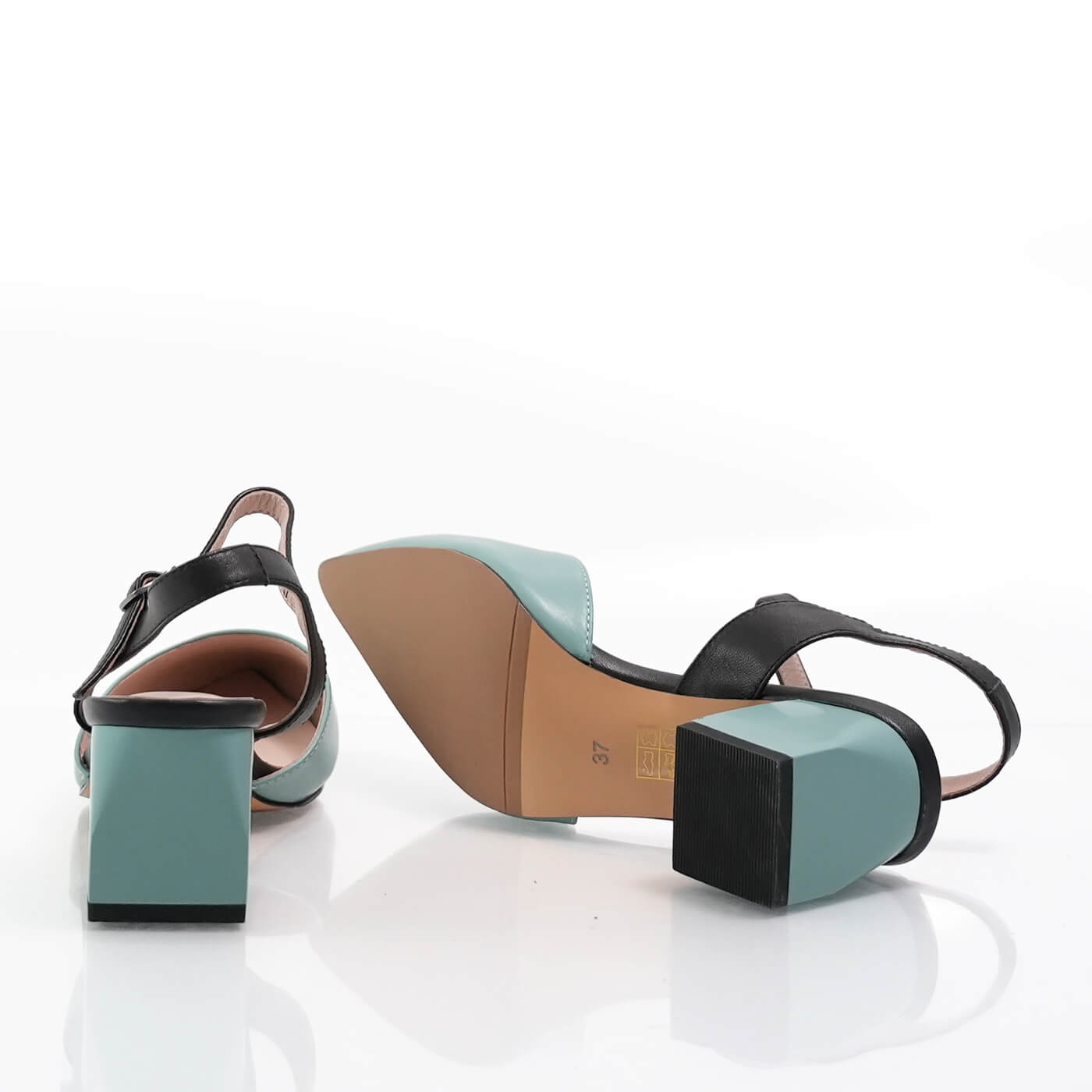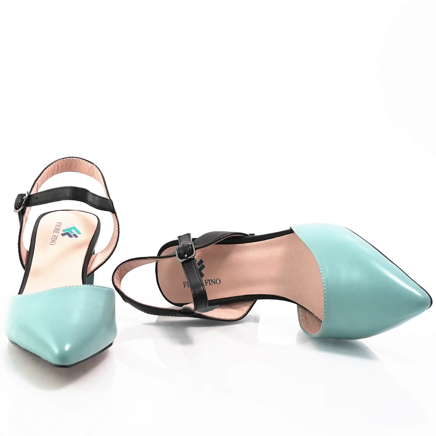 Imbratiseaza un stil curat si contemporan cu pantofii Fiore Fino, confectionati din piele naturala de cea mai inalta calitate. Cu o nuanta de aqua pastel si barete negre fine, acest model este esenta elegantei discrete. Tocul inedit, cu forma geometrica, ofera o stabilitate excelenta si adauga o nota de modernism tinutelor tale cotidiene sau de seara.