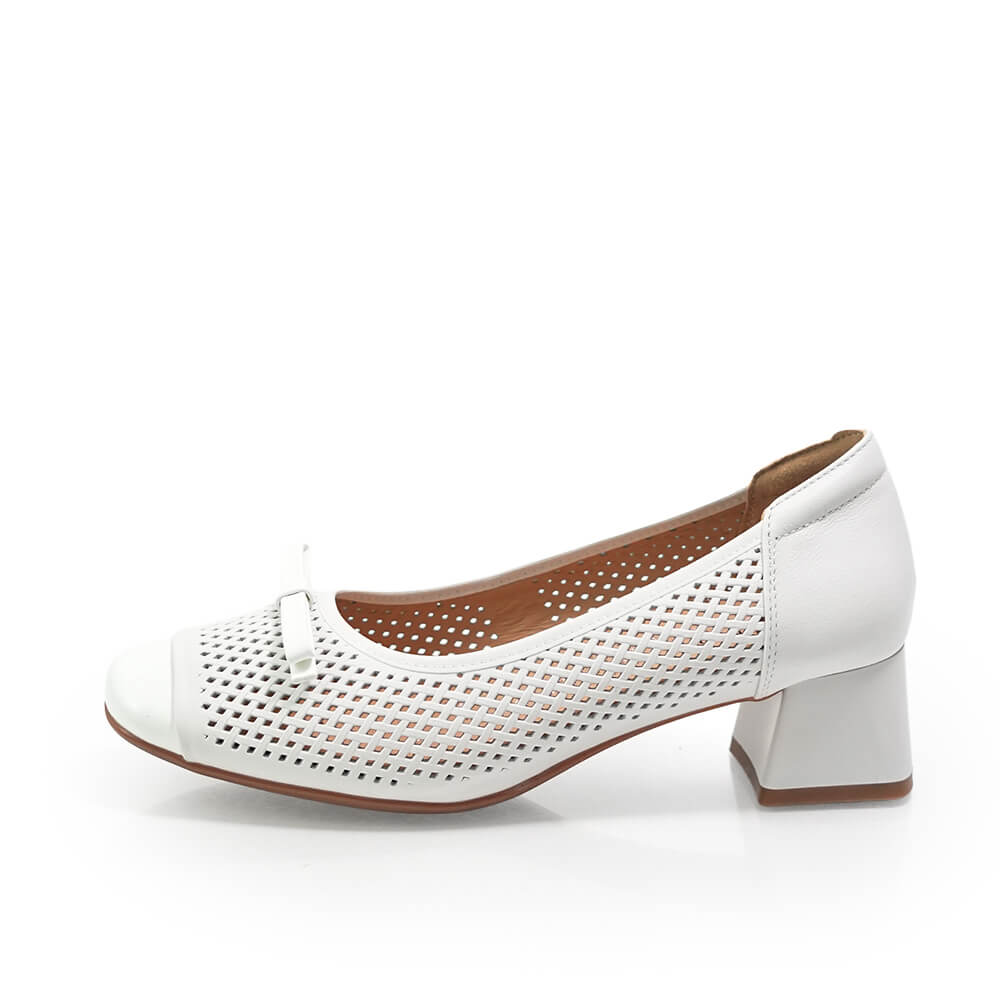 Modelul face parte din linia Fiore Fino Confort si este realizat din piele naturala moale, cu perforatii fine care permit piciorului sa respire. Tocul mediu, stabil, ofera sustinere fara sa incarce mersul, iar forma usor rotunjita a varfului pastreaza o linie eleganta si feminina.