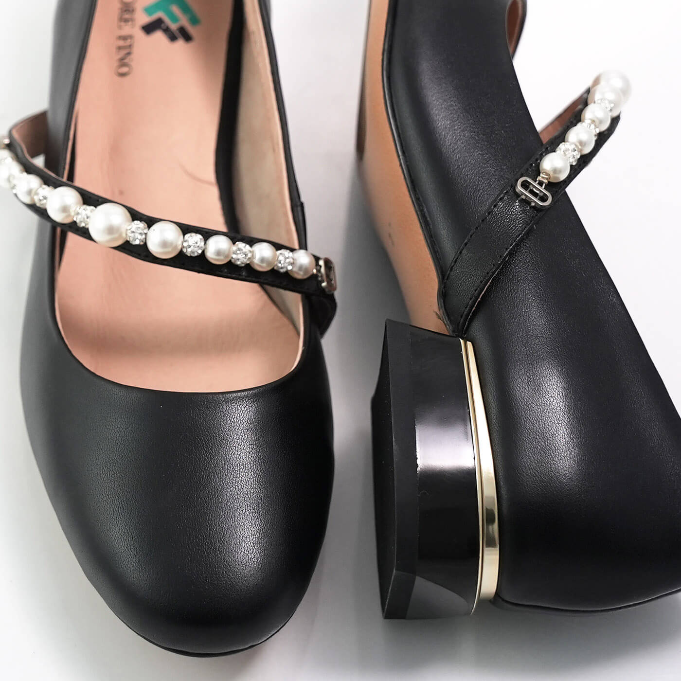 Redescopera clasicul stil Mary Jane cu o nota moderna in aceasta pereche de pantofi eleganti. Confectionati din piele naturala, acesti pantofi negri sunt accesorizati cu o banda ornata cu perle si cristale, ce adauga un contrast sofisticat. Tocul gros, metalic si lucios, nu doar ca ofera o stabilitate excelenta, dar adauga si un element distinctiv designului. Ei sunt perfecti pentru a adauga un strop de rafinament oricarei tinute, fie ca este vorba despre o zi la birou sau o seara speciala.