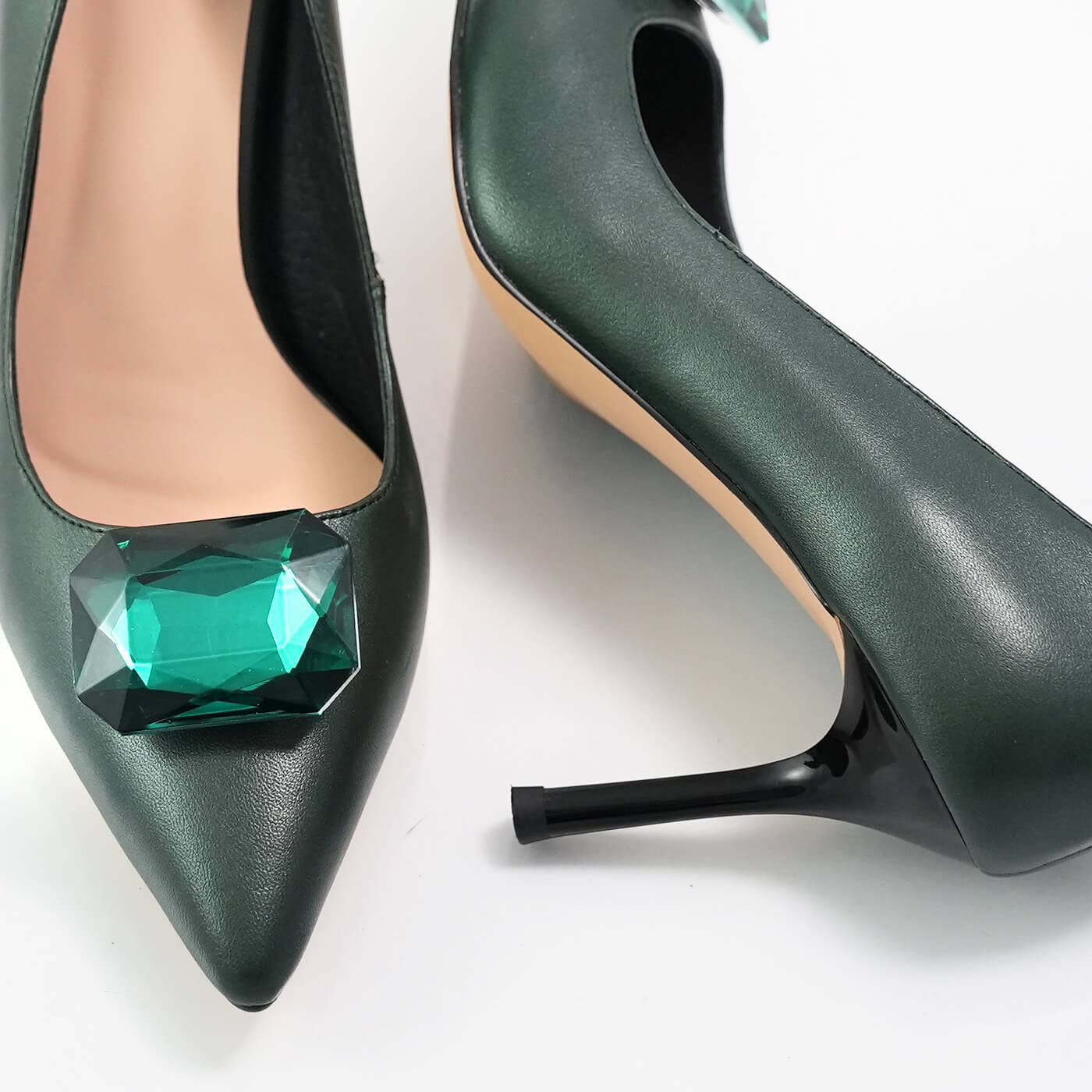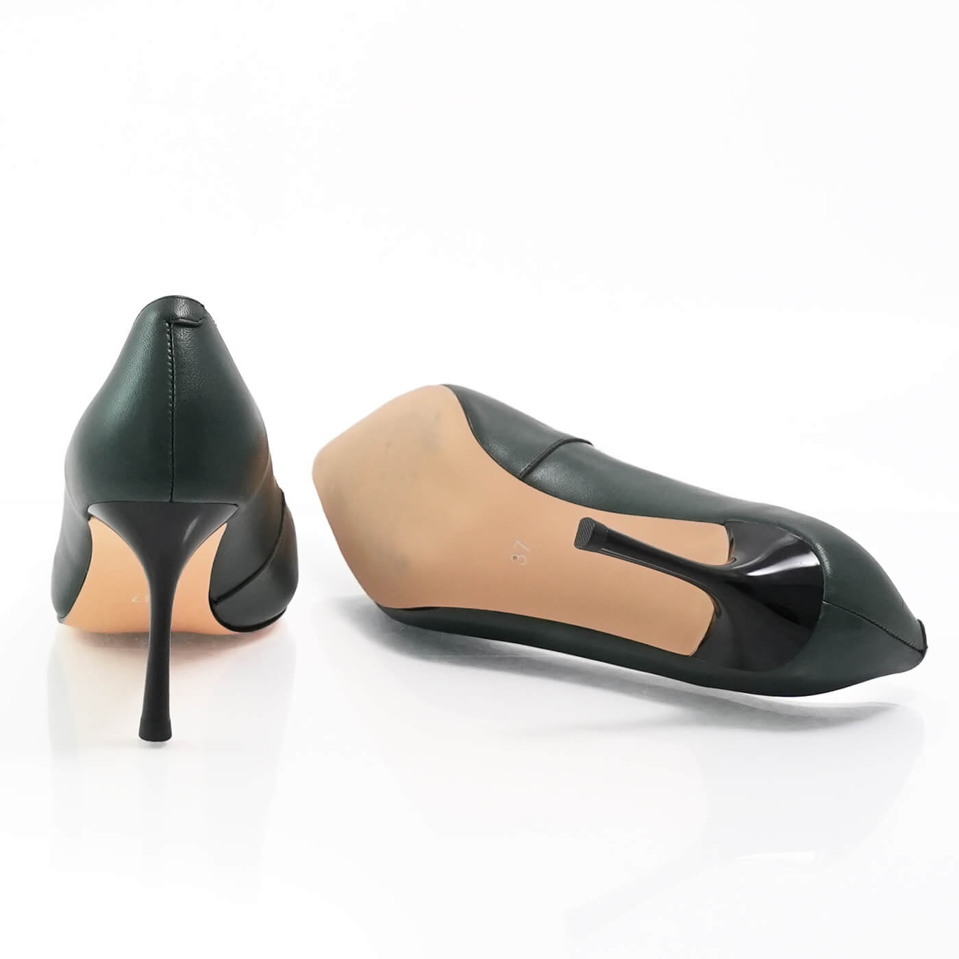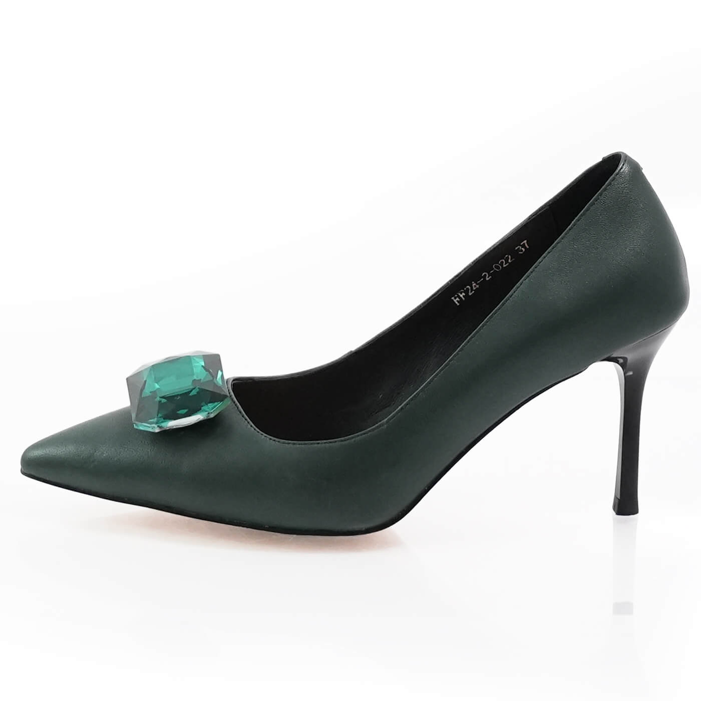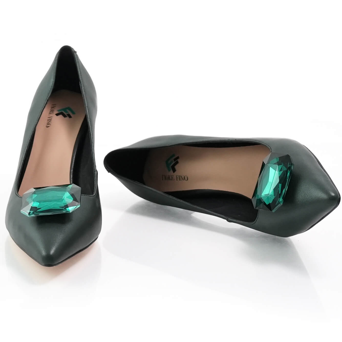 Eleganta si indrazneata, aceasta pereche de pantofi stiletto Fiore Fino se remarca prin accesorizarea cu o bijuterie stralucitoare, un detaliu ce transforma incaltamintea clasica intr-un statement de moda. Finisajul lor in nuanta de verde profund, impreuna cu tocul subtire de aproximativ 8 cm, desavarsesc orice tinuta cu o nota de rafinament. Creati pentru a impresiona, acesti pantofi sunt alegerea perfecta pentru femeia care doreste sa adauge un strop de lux garderobei sale.