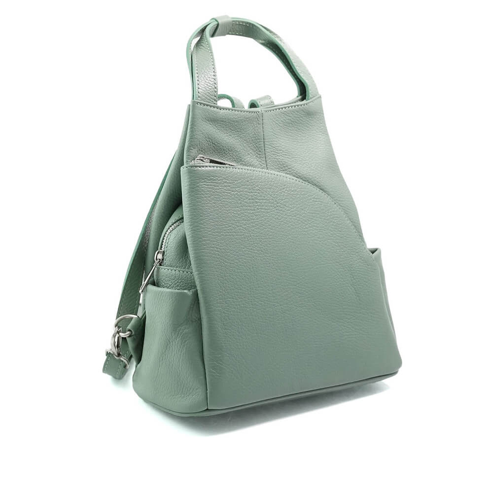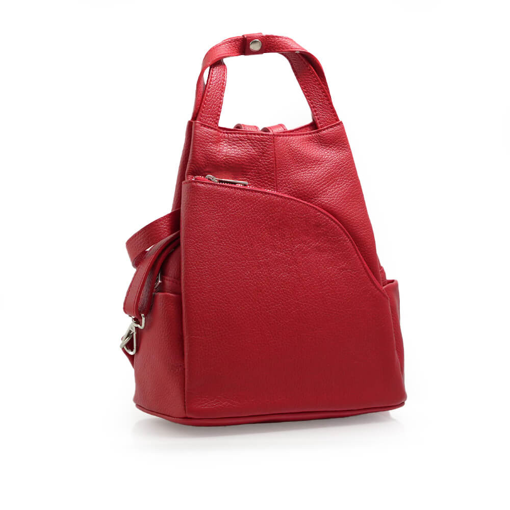 Rucsacul este prevazut cu un maner din piele pentru a fi purtat in mana sau pe brat si doua barete de umar reglabile.