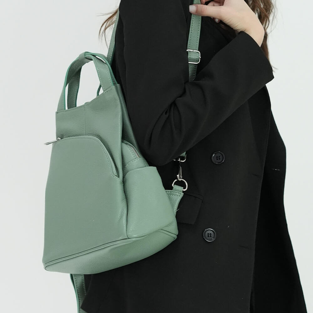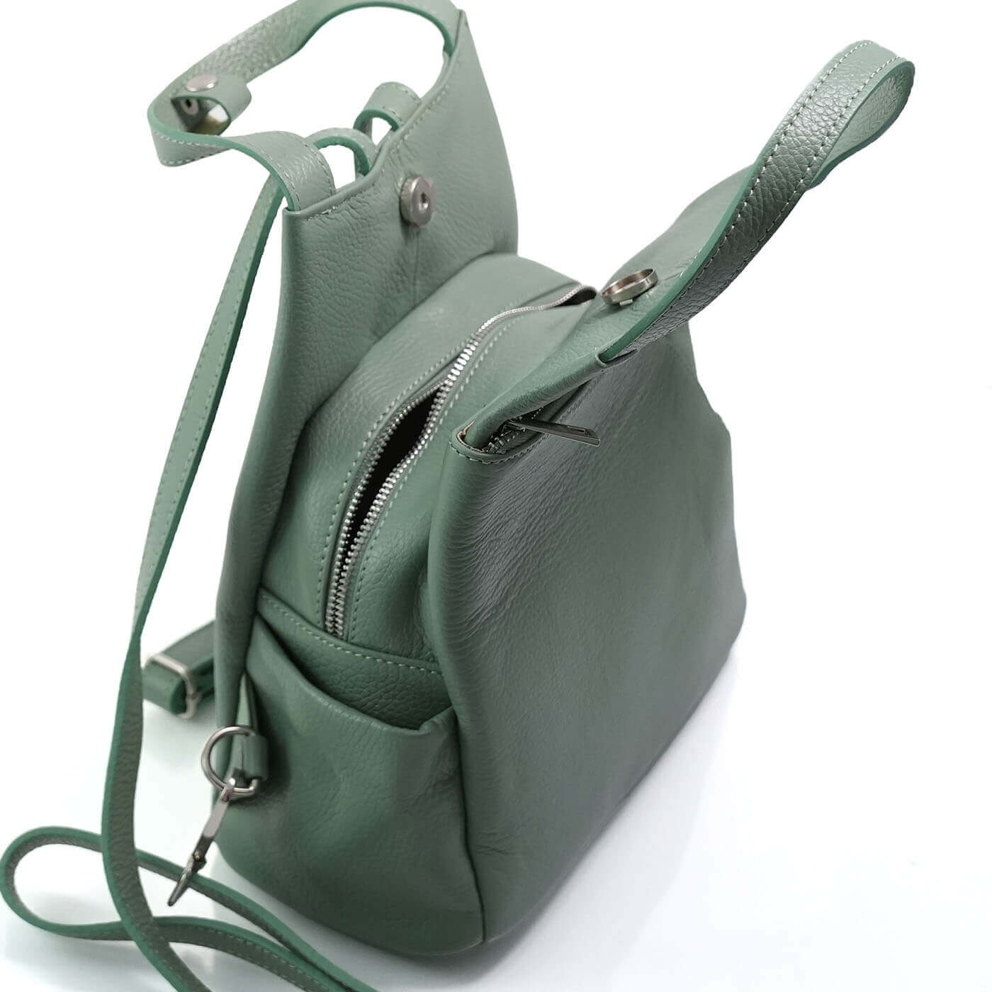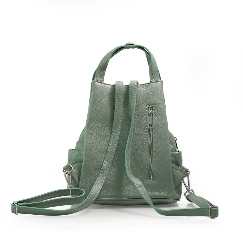 Rucsacul este prevazut cu doua barete din piele pentru a fi purtat in mana sau pe brat si doua barete de umar reglabile.