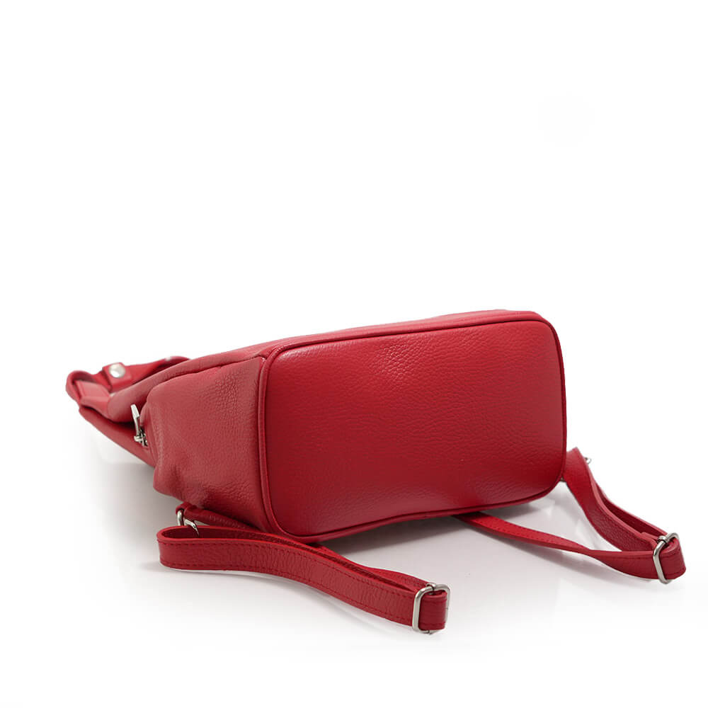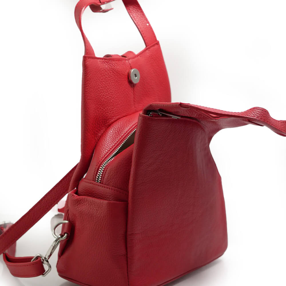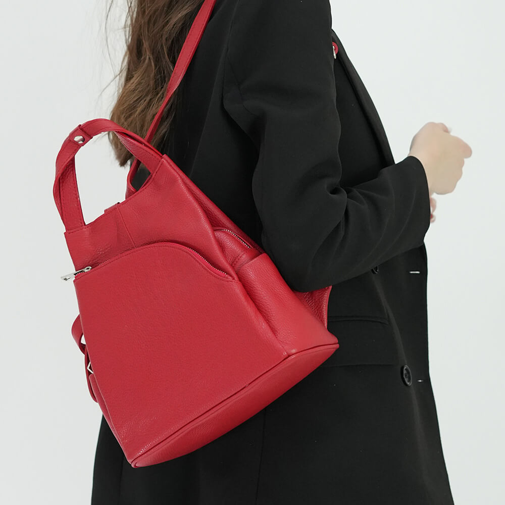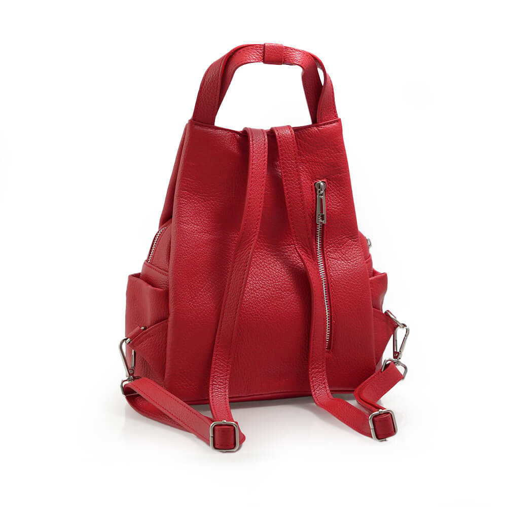 Rucsacul este prevazut cu doua barete din piele pentru a fi purtat in mana sau pe brat si doua barete de umar reglabile.